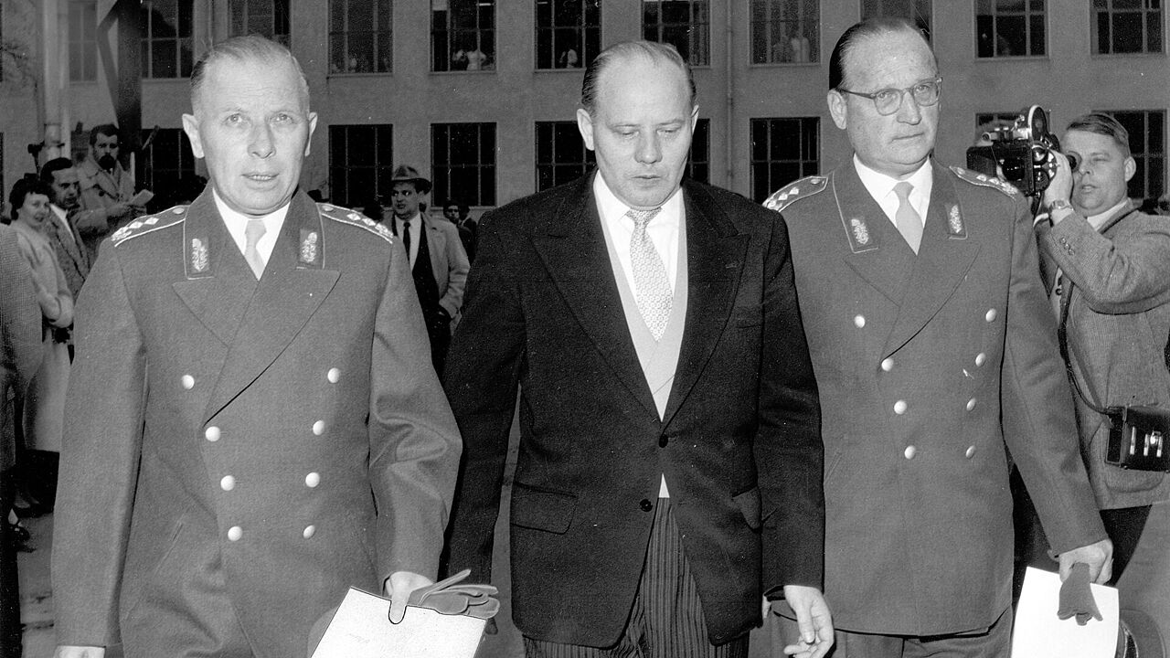 Die Himmeroder Denkschrift, die vor 75 Jahren, am 9. Oktober 1950, vorgelegt wurde, prägt bis heute die DNA der Bundeswehr. Mitgeschrieben haben der spätere erste Generalinspekteur Adolf Heusinger (links) und General Hans Speidel (rechts), später erster deutscher Oberbefehlshaber der alliierten Landstreitkräfte (LANDCENT). In der Mitte des Bildes der erste Verteidigungsminister Theodor Blank (CDU). Foto: Bundesarchiv