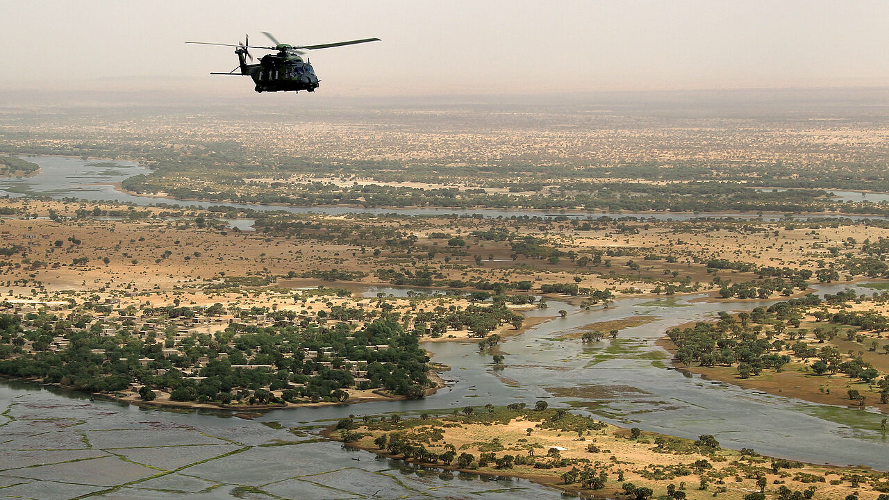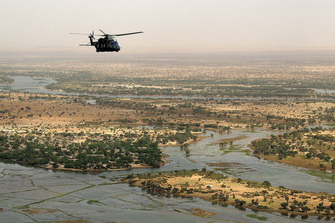 Ein Mehrzweckhubschrauber NH-90 fliegt in der Nähe von Gao/Mali im Rahmen der UN-Mission MINUSMA. Transportflüge mit CH-53 sind bis auf Weiteres ausgesetzt. Foto: Bundeswehr/Sebastian Wilke