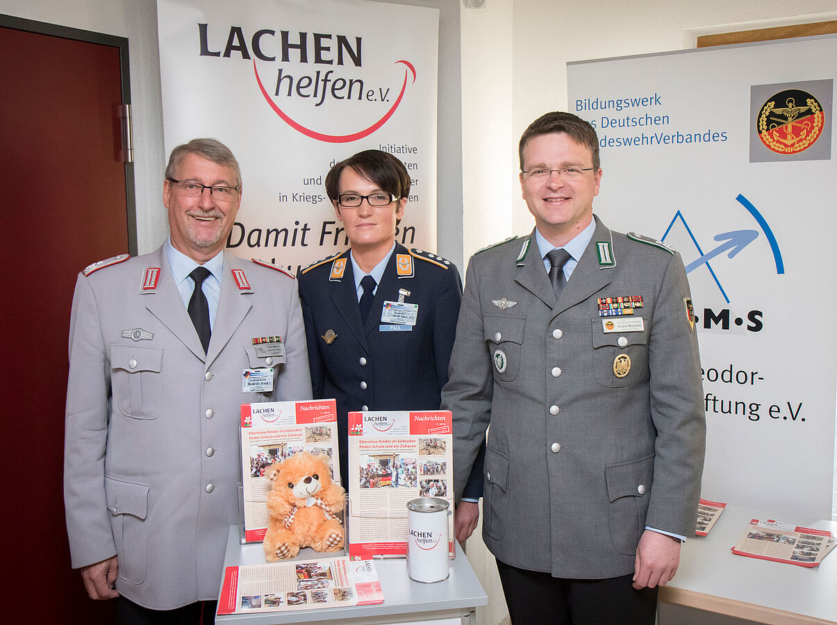 von links: Oberstleutnant d.R. Roderich Thien, Vorsitzender Lachen Helfen e. V., Hauptmann Laura Paul, Mitglied im Vorstand von Lachen Helfen e. V., DBwV-Chef André Wüstner. Foto: DBwV