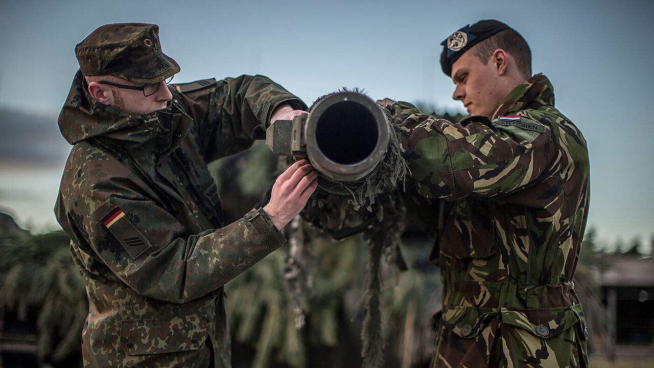 Ein Kampfpanzer des binationalen Panzerbataillons 414 wird von einem deutschen und einem niederländischen Soldaten für den Einsatz vorbereitet. Foto: Bundeswehr