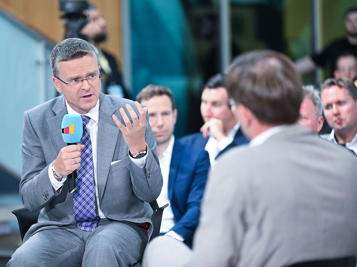 100 Milliarden Euro Sondervermögen, schön und gut: Aber der planerische Bedarf der Bundeswehr liegt bei 286 Milliarden Euro. Das sei die Lage und nichts anderes, erklärt der Bundesvorsitzende Oberst André Wüstner im Gespräch mit Professor Sönke Neitzel bei der Diskussion beim CDU-Panel im Konrad-Adenauer-Haus. Foto: Nils Hasenau