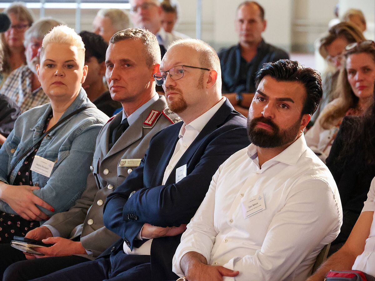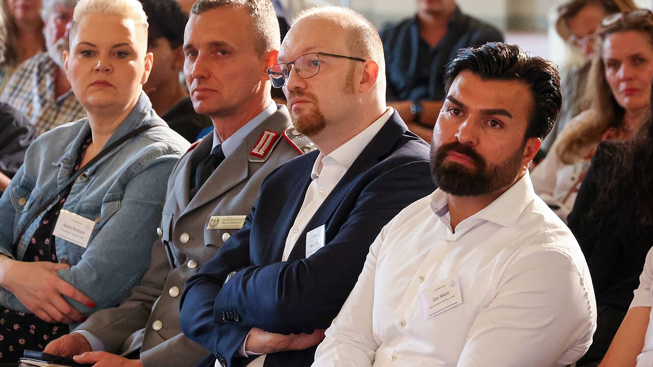 Die Lage von mehr als 100 afghanischen Ortskräften ist zwei Jahre nach dem Abzug der Bundeswehr vom Hindukusch immer noch unklar: Das war auch Thema beim 2. Ortskräftekongress mit (v.li.) Oberstleutnant i.G. Marcel Bohnert, stellv. Vorsitzender Deutscher BundeswehrVerband, Marcus Grotian vom Partnerschaftsnetzwerk und Qais Nekzai.
