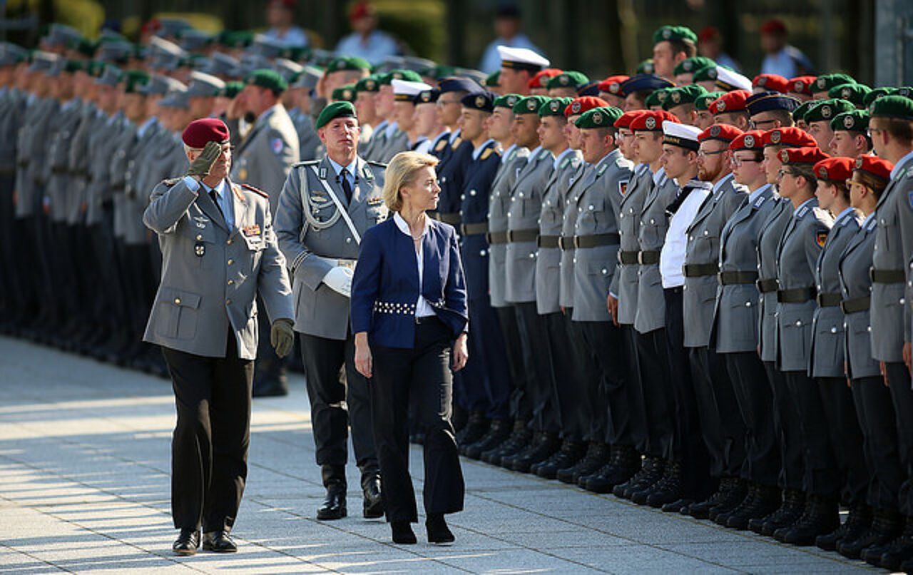 Verteidigungsministerin Ursula von der Leyen und Generalinspekteur General Eberhard Zorn schreiten die Gelöbnisaufstellung ab Foto: Bundeswehr/Sebastian Wilke