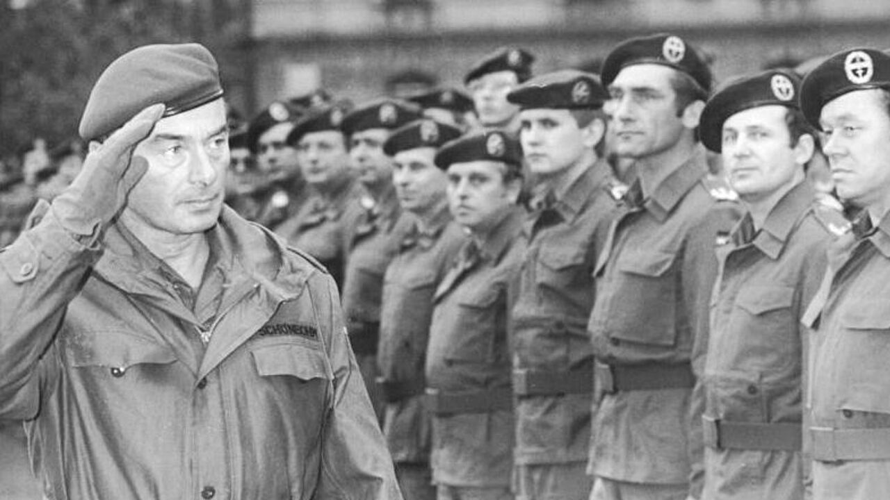 Am 4. Oktober 1990, einen Tag nach der deutschen Wiedervereinigung, übernahm Jörg Schönbohm, Befehlshaber des Bundeswehrkommandos Ost, das Wehrbereichskommando VII der Bundeswehr, vormals Wehrbezirk III der Nationalen Volksarmee. Foto: Bundesarchiv