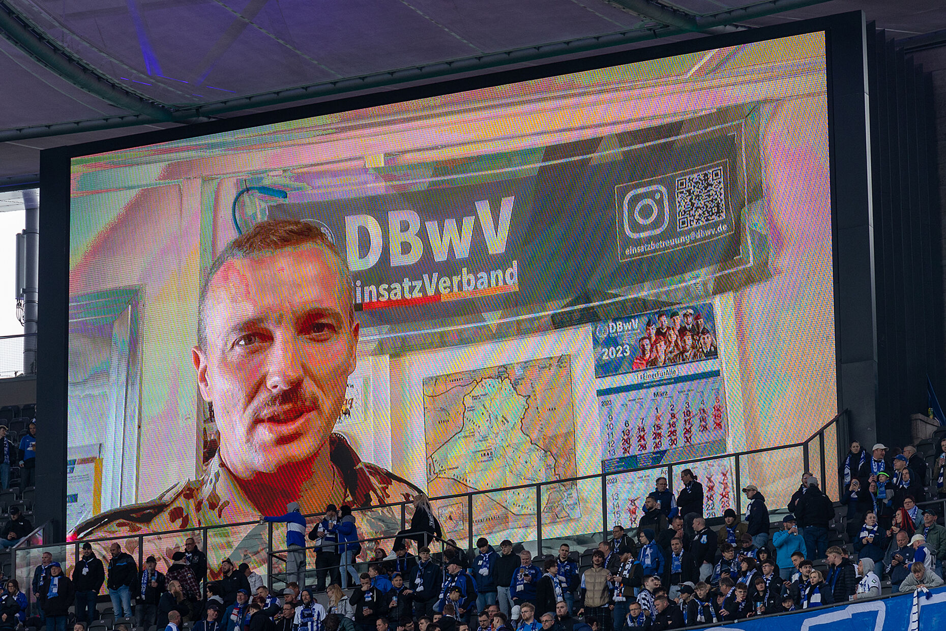 Eine wiederholte Aktion der Hertha, die sowohl bei den besonderen Gästen des Tages mit oder ohne Uniform wie auch bei den Zuschauerinnen und Zuschauern bestens ankam. „Es gab nur positives Feedback“, sagt Hauptmann Ingo Zergiebel, Vorsitzender Ehemalige, Reservisten und Hinterbliebene im DBwV-Bundesvorstand und gemeinsam mit Oberstabsfeldwebel Uwe Hahn und Stabshauptmann Andreas Quirin im Projektteam des Verbandes für die Kooperation mit Hertha BSC. Zergiebel weiter: „Es kommen Äußerungen wie ‚danke für euren Einsatz‘ oder ‚toll, dass ihr da seid‘. Ich glaube, viele Menschen sind dankbar, uns mal so in der Öffentlichkeit sehen zu können.“