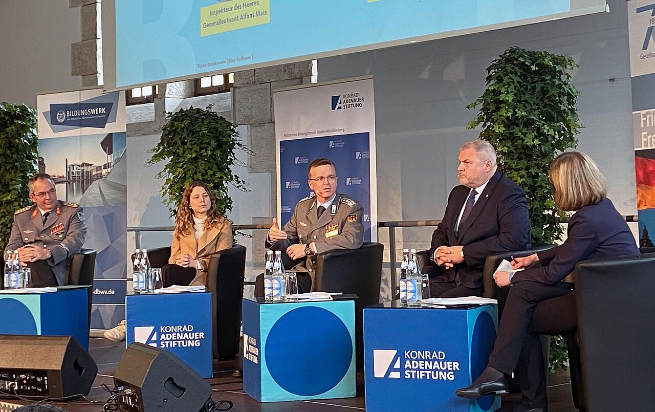 Generalleutnant Alfons Mais, Jamila Schäfer (B‘90/Die Grünen), Oberst André Wüstner, DBwV-Bundesvorsitzender, General a.D. Riho Terras und Moderatorin Nora Müller (v.l.) auf dem Panel der 10. Königsbronner Gespräche Foto: DBwV/Oliver Krause