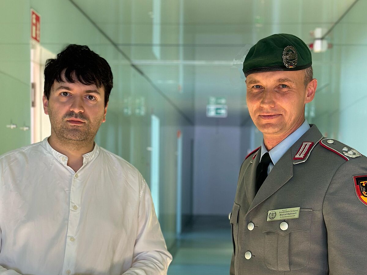 Bohnert war zuletzt für einige Monate als Berater für Informationskriegsführung im Bagdad eingesetzt und hat irakische und kurdische Sicherheitskräfte in ihrem Online-Kampf gegen das virtuelle Kalifat des selbsternannten Islamischen Staates unterstützt. Durch seine Erfahrungen sieht er einigen Aufholbedarf mit Blick auf das zu erwartende Aufgabenspektrum der Bundeswehr: „Zukünftig werden Kriege noch mehr als bisher im Informationsraum ausgetragen. Ich habe es im Irak erlebt, und wir sehen es derzeit in der Ukraine: Der klassische Panzer- und Infanteriekampf mischt sich zu erheblichen Teilen mit Social Media-Warfare - etwa mit Desinformationskampagnen, Deep Fakes sowie umfangreichen K.I.- und Bot-Nutzungen, gepaart mit immer kürzeren Innovationszyklen", so Bohnert. Zum Abschluss des Gesprächs vereinbarten Sven Weizenegger und Marcel Bohnert einen regelmäßigen Austausch und identifizieren derzeit Wege möglicher Kooperationen.