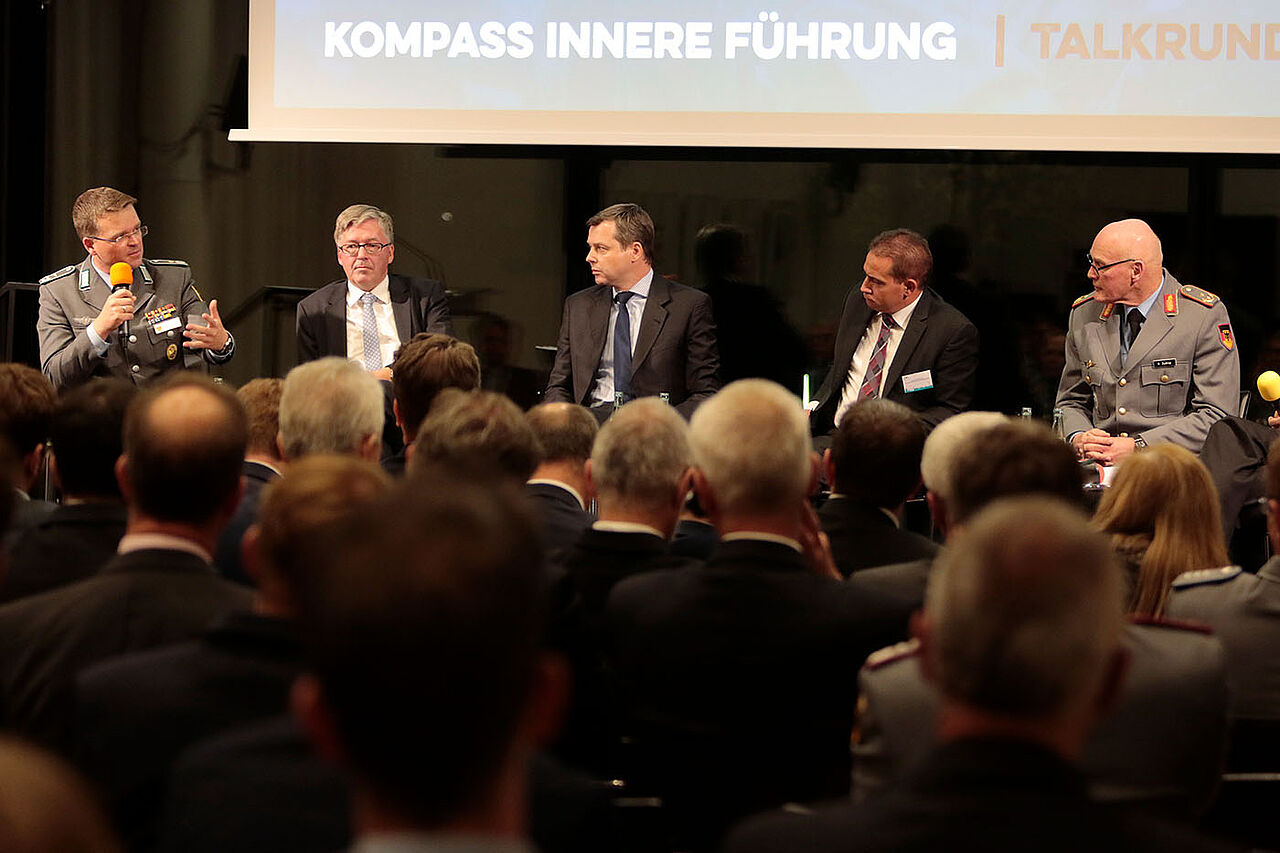 Der DBwV-Bundesvorsitzende Oberstleutnant André Wüstner (l.) bei der Diskussion Foto: Bundeswehr/Schönbrodt