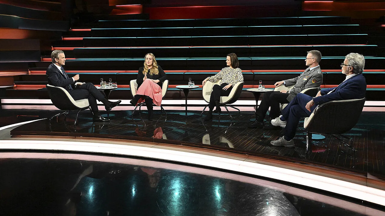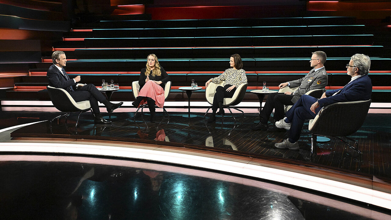Zu seinem Talk hatte Markus Lanz (l.) neben Oberst André Wüstner (2.v.r.) die Grünen-Co-Vorsitzende Katharina Dröge (2.v.l.), die FAZ-Journalistin Julia Löhr und den Politikwissenschaftler Wolfgang Merkel eingeladen. Foto: Cornelia Lehmann
