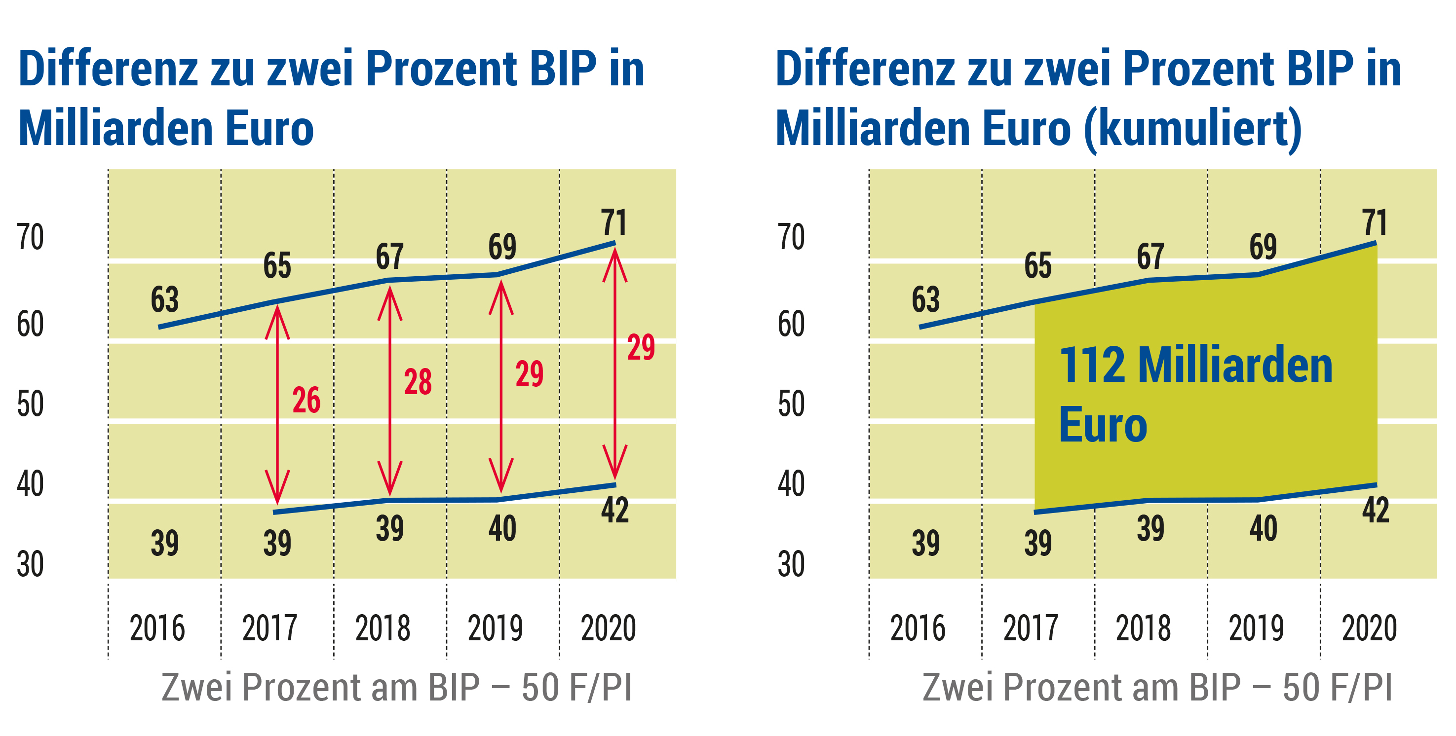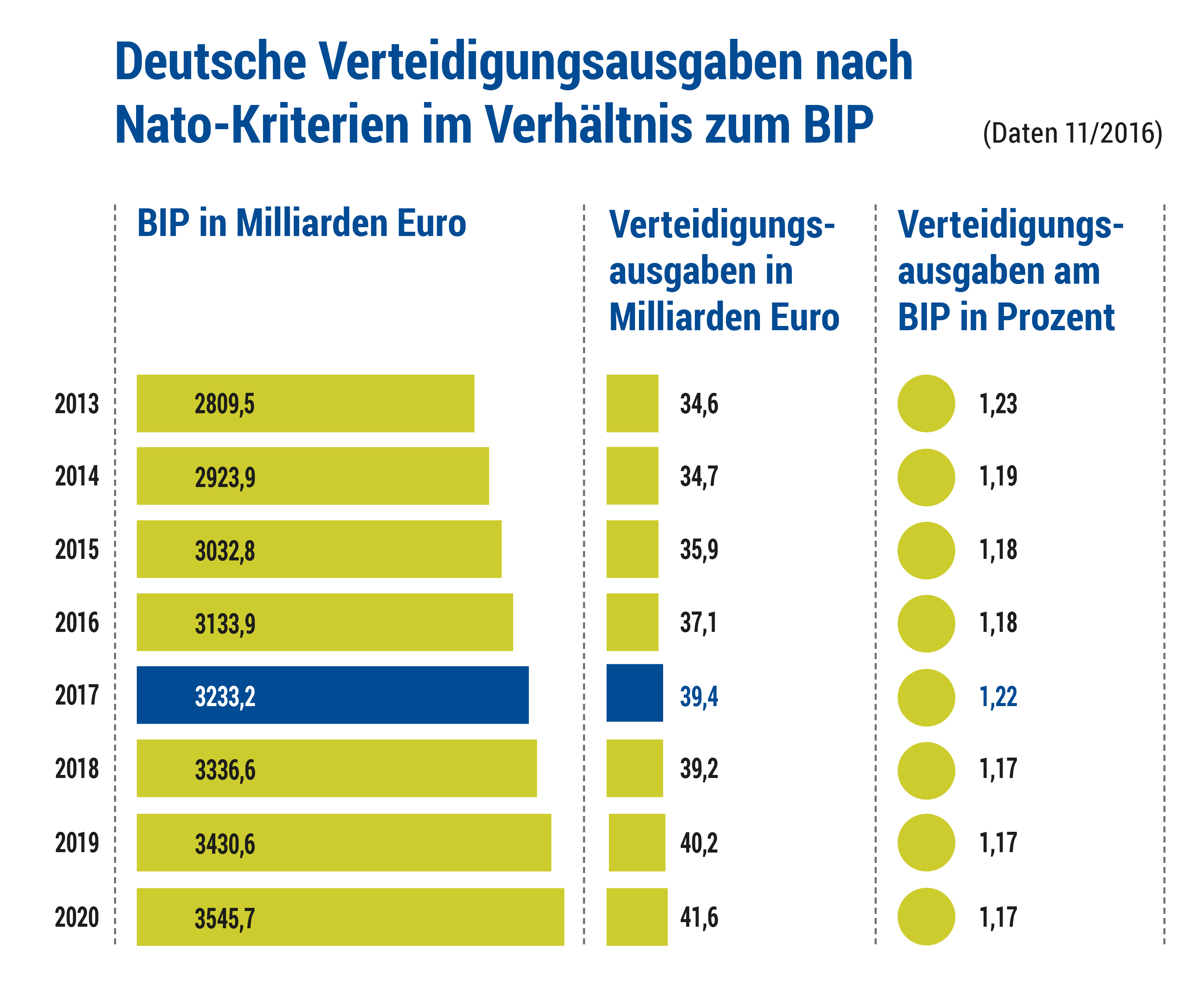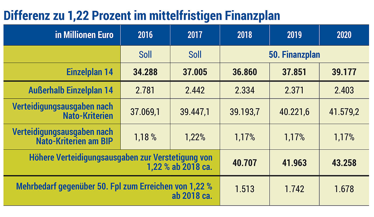 Die eindeutigen Äußerungen von Donald Trump zur unzureichenden Lastenteilung innerhalb der Nato im Nacken, den Beschluss für den vorläufigen Haushalt 2018 vor der Brust – da lohnt sich ein Blick auf die Zahlen. Zugegeben und unbestritten positiv: Der Verteidigungsetat steigt. Doch dem von der Nato vorgegebenen Ziel von zwei Prozent am BIP kommen wir so nicht nahe genug.