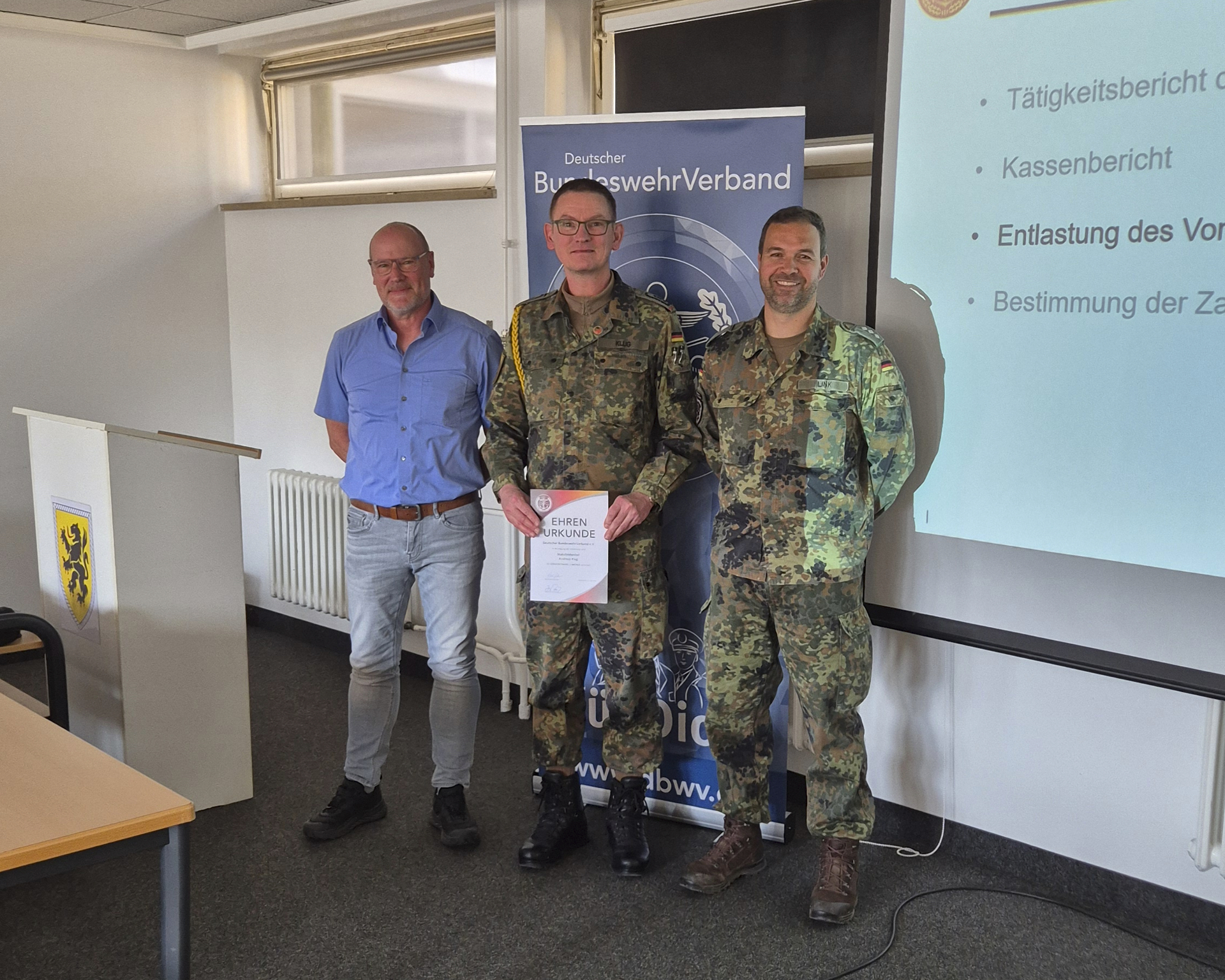 Ein wesentlicher Erfolgsfaktor war dabei die enge und vertrauensvolle Zusammenarbeit mit den Truppenkameradschaften am Standort. Ohne dieses Miteinander wäre die vielfältige Verbandsarbeit in dieser Form nicht möglich gewesen. Stellvertretend für diesen Einsatz wurde der langjährige TruKa-Vorsitzende Stabsfeldwebel Andreas Klug mit der Verdienstnadel in Bronze ausgezeichnet.