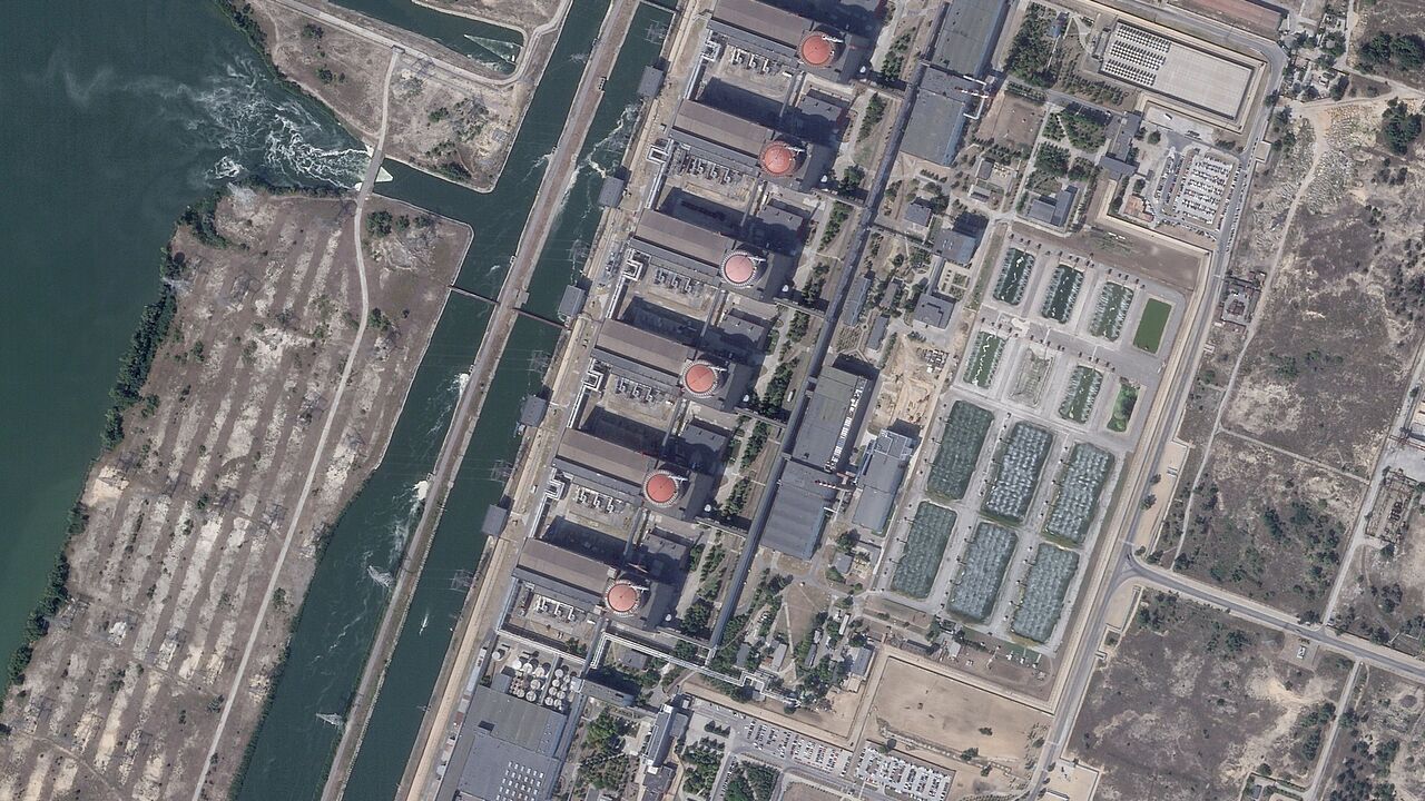 Ein Satellitenfoto vom 2. September 2019 zeigt Europas größtes Kernkraftwerk Saporischschja in intaktem Zustand. Das seit März 2022 mehrfach beschossene Atomkraftwerk liegt direkt am Fluss Dnipro im Südosten der Ukraine. Es hat sechs Druckwasserreaktoren russischer Bauart mit jeweils 1000 Megawatt Nettoleistung Foto: AP