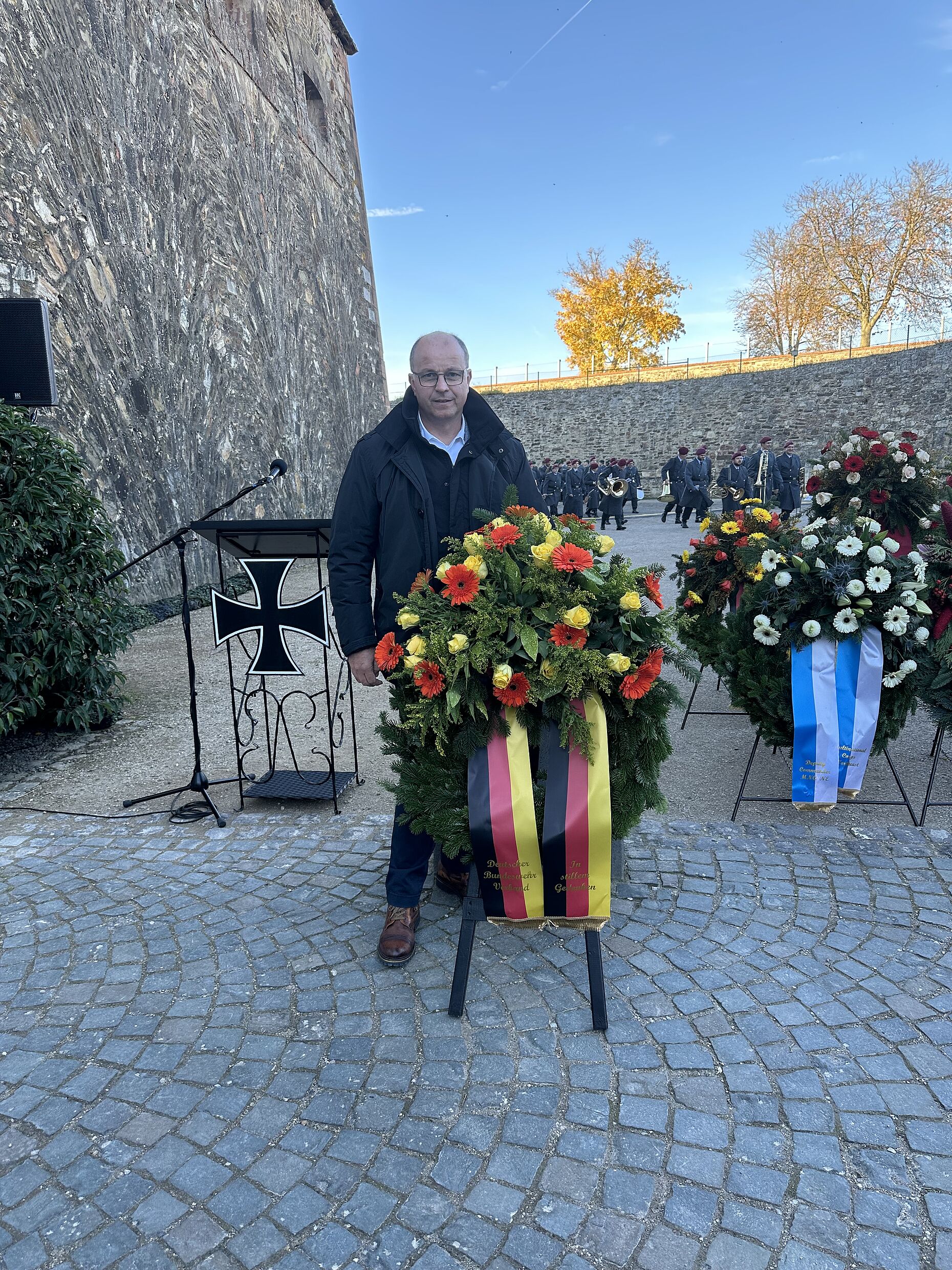 In der Fläche waren weitere Mandatsträger des DBwV – von der Kameradschafts- bis zur Bundesvorstandsebene – unterwegs, um an verschiedenen Gedenkveranstaltungen zum Volkstrauertag teilzunehmen. Fregattenkapitän Marco Thiele legte für den Vorstand Marine einen Kranz am Ehrenmal der Marine in Laboe nieder. Bereits im Vorfeld hatte der stellv. Vorsitzende Heer, Oberstabsfeldwebel a.D. Frank Heidemann, einen Kranz am Ehrenmal des Heeres auf der Festung Ehrenbreitstein in Koblenz niedergelegt. Der Vorsitzende Luftwaffe, Oberstabsfeldwebel Heiko Stotz, nahm an der Gedenkveranstaltung am neuen Ehrenmal der Luftwaffe in Roth teil.