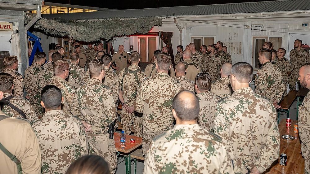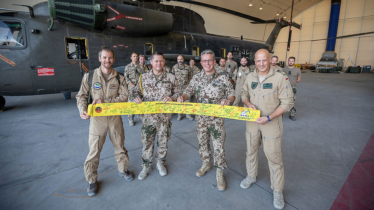 Generalleutnant Ingo Gerhartz (r.) und Hauptmann Andreas Steinmetz (2.v.r.) überbrachten den Soldaten in Masar-e-Sharif ein gelbes Band der Solidarität.
