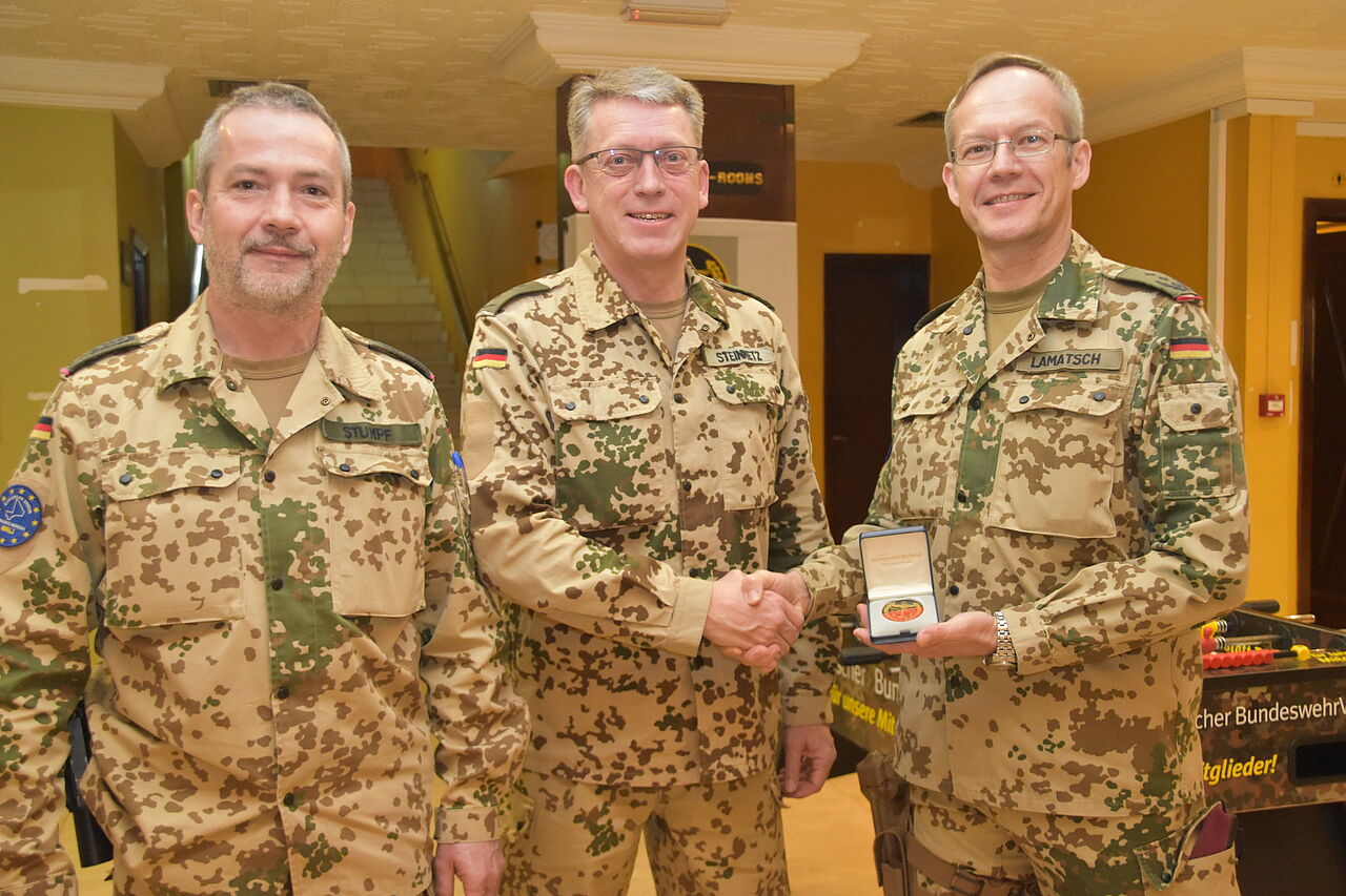 OStFw Stumpf, Hptm Steinmetz und Oberst i.G. Lamatsch, Stellvertretender Missionskommandeur der EUTM Mali(v.l.), bei der Übergabe des Coins des DBwV Foto: DBwV
