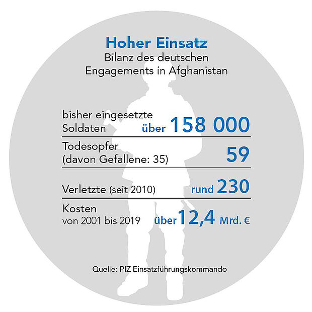 Vieles ist in Vergessenheit geraten: Ein Sozialdemokrat war Bundeskanzler, ebenso der Verteidigungsminister. Ein Grüner war Bundesaußenminister und Vizekanzler. Tempi passati, aber sie stehen für den umfangreichsten und längsten Auslandseinsatz in der Geschichte der Bundeswehr, in der Geschichte deutscher Streitkräfte überhaupt. Seit fast 20 Jahren sind deutsche Soldatinnen und Soldaten am Hindukusch im Einsatz. Fast 160.000 Männer und Frauen haben dort ihren Dienst getan. 59 verloren dabei ihr Leben, 35 von ihnen sind bei Anschlägen ums Leben gekommen oder in Gefechten gefallen.