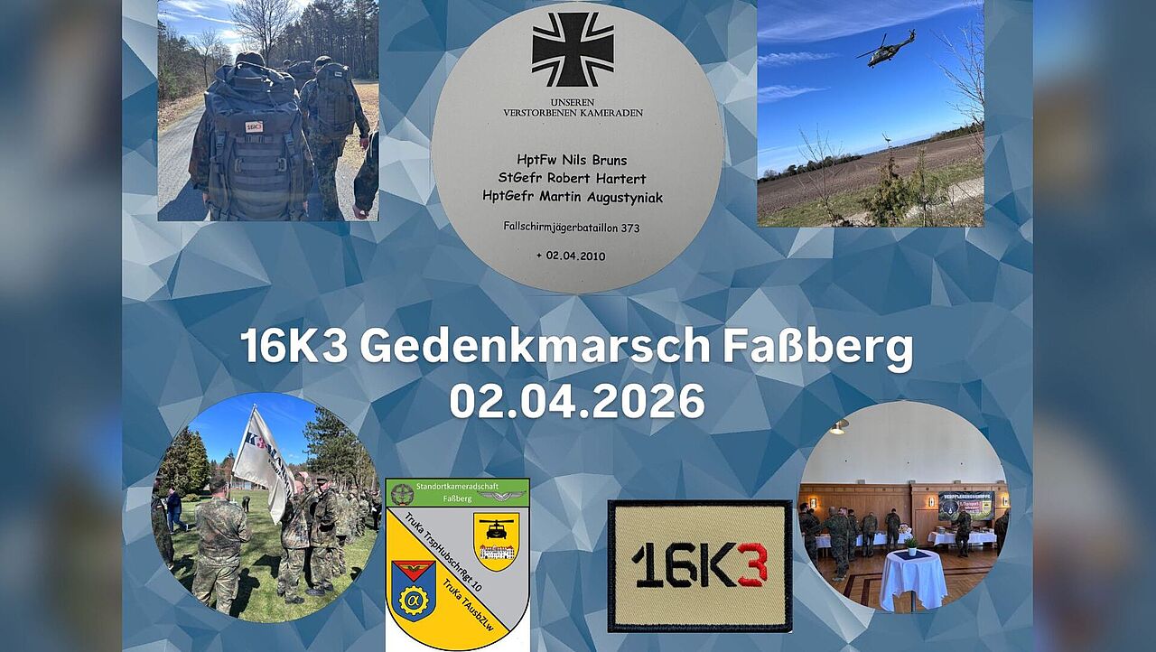 Faßberg. Die Standortkameradschaft Faßberg hat den örtlichen 16 K3 Marsch unterstützt. Die „16” steht für das Gedenken an das Karfreitagsgefecht in Afghanistan vor 16 Jahren. Die Veranstaltung wurde von der Bürgermeisterin der Gemeinde Faßberg, Kerstin Speder, begleitet, die damit ihre Solidarität zur Bundeswehr sowie den verwundeten und gefallenen Kameraden zeigte.