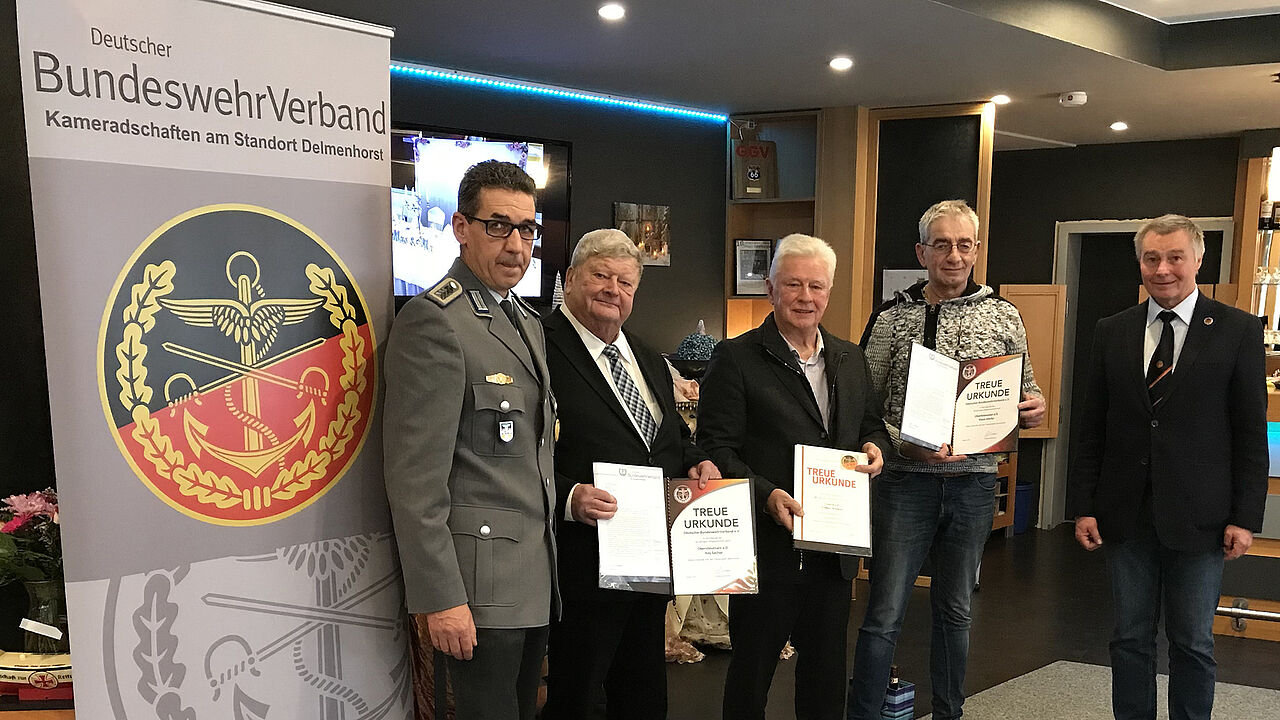 Bei der Ehrung in Delmenhorst (v.l.n.r.): Oberstabsfeldwebel Oliver Sekuli, Oberstleutnant a.D. Kay Sachse, General a.D. Volker Wieker, Oberfeldwebel d.R. Klaus Alecke und Oberstleutnant a.D. Harald Mauritz. Foto: LV Nord