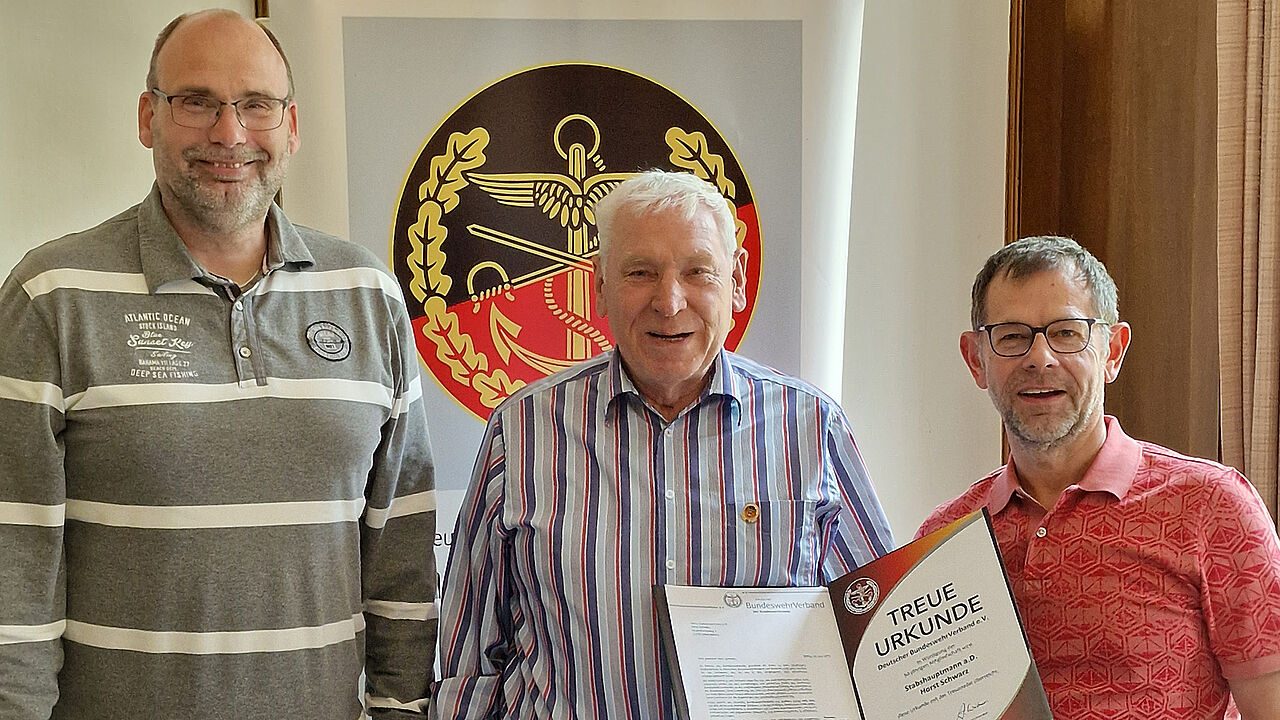 Lüneburg. Während einer Vorstandssitzung der ERH-Kameradschaft Lüneburg wurde der Stabshauptmann a.D. und Beisitzer Horst Schwarz für 50 Jahre Mitgliedschaft im DBwV geehrt. Dies übernahm Hauptmann a.D. Michael Scholz, neuer Vorsitzender ERH im Landesverband Nord, zusammen mit dem Kameradschaftsvorsitzenden Stabsfeldwebel a.D. Dirk Jersch.