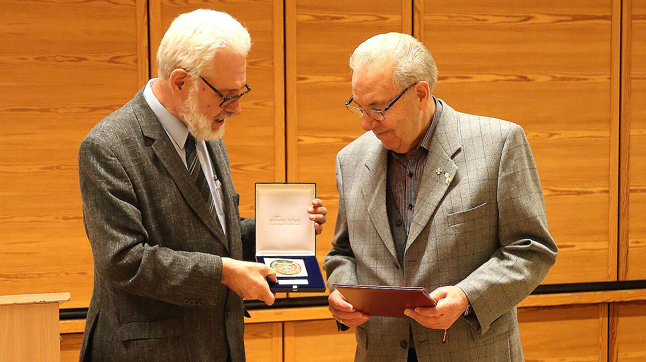 Wilhelm Schäfer (r.) erhält für sein Engagement die Verbandsplakette aus den Händen von Thomas Sohst, Vorsitzender LV West. Foto: Gerhard Peters