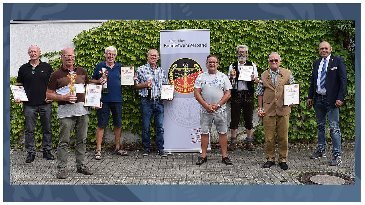 Bezirksvorsitzender Stabsfeldwebel a.D. Matthias Schneider informierte über die Verbandsarbeit im Landesverband unter den besonderen Bedingungen von Corona. So werde seine Bezirkstagung wie alle anderen Landestagungen auf Bezirksebene stattfinden. Die Vorbereitungen zur Landesversammlung im kommenden Jahr laufen. Vorsitzender Schäfer ehrte gemeinsam mit dem Bezirksvorsitzenden langjährige Mitglieder. Für die zu ehrenden Kameraden gab es zur gerahmten Urkunde und Treuenadel für 50, 40 und 25 Jahre Mitgliedschaft ein kleines Weinpräsent. Zu den Geehrten gehörten: Oberstleutnant a.D. H. Schlomach, Stabsfeldwebel a.D. P. Gloge und Hauptmann a.D. W. Kellert (50 Jahre), Oberstabsfeldwebel a.D. W. Wallmeier und Obergefreiter d.R. K-W Hurst (40 Jahre) sowie Oberstleutnant d.R. H. Mandt (25 Jahre).