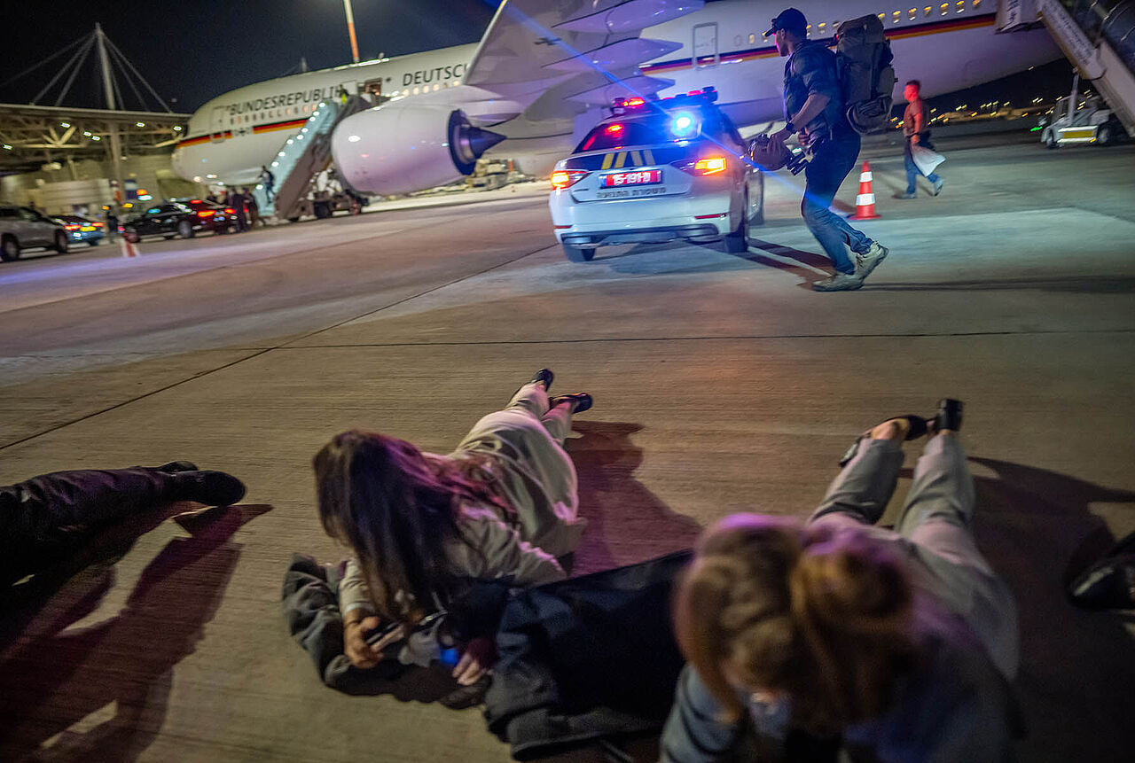 Personen liegen auf dem Flughafen von Tel Aviv vor dem Luftwaffen-Airbus von Bundeskanzler Scholz auf dem Boden. Die Delegation des Bundeskanzlers hatte vor dem Abflug nach Kairo wegen eines Raketenalarms schlagartig das Flugzeug verlassen müssen. Foto: picture alliance/dpa Pool/Michael Kappeler