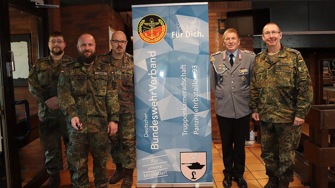 Munster. Der stellvertretende Landesvorsitzende, Stabsfeldwebel a.D. Gerd Dombrowski, hat gemeinsam mit dem Vorsitzenden der Truppenkameradschaft, Stabsfeldwebel Peter Kretschmann, drei Angehörige des Panzerlehrbataillons 93 geehrt. Die Kameraden wurden für ihre ehrenamtliche Tätigkeit als Ansprechpartner im Auslandseinsatz während der 9. Rotation enhanced Forward Presence (eFP) in Litauen ausgezeichnet. Bei einer anschließenden Gesprächsrunde war auch ihr Bataillonskommandeur Oberstleutnant Sebastian Worgull dabei.