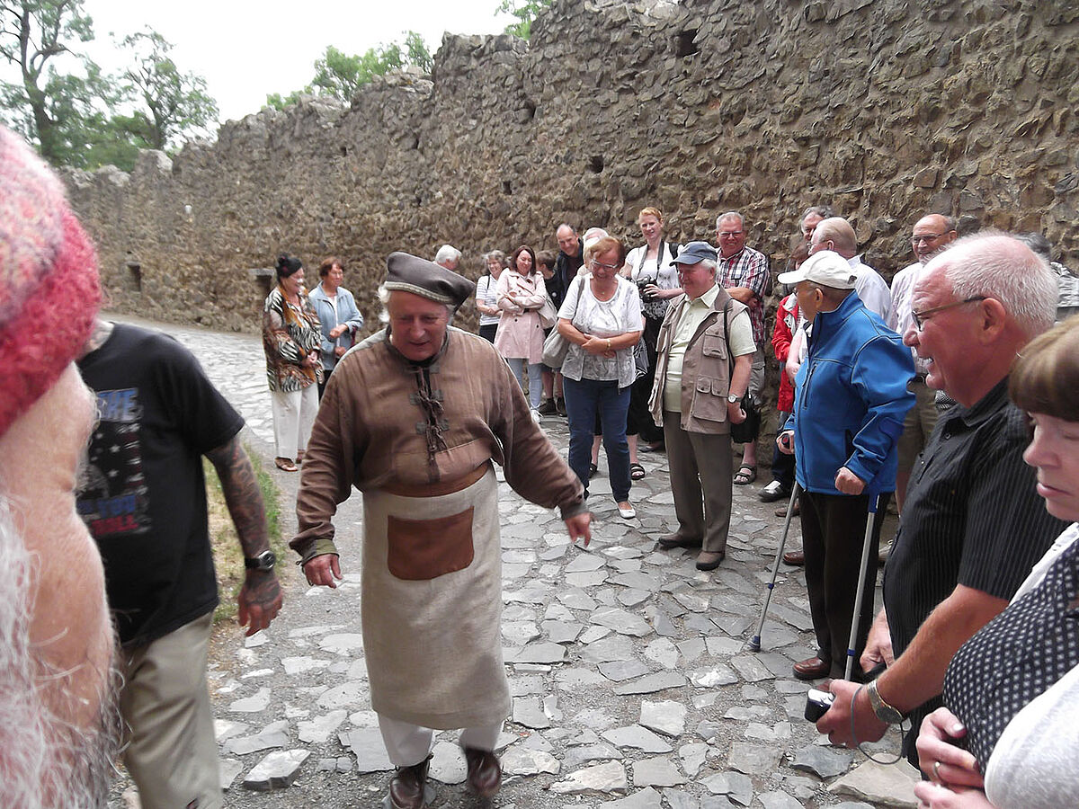 Mit mittelalterlichen Klängen wurde die Besuchergruppe bereits erwartet und musste erst um „Einlass begehren“. Erst dann gewährte Knecht Hans (Hans Jerusel) ihnen den Zutritt. Hans persönlich übernahm dann auch die Führung durch das historische Gemäuer. Zunächst machte er aber mit den mittelalterlichen Gepflogenheiten sowie der Historie der Burg vertraut.