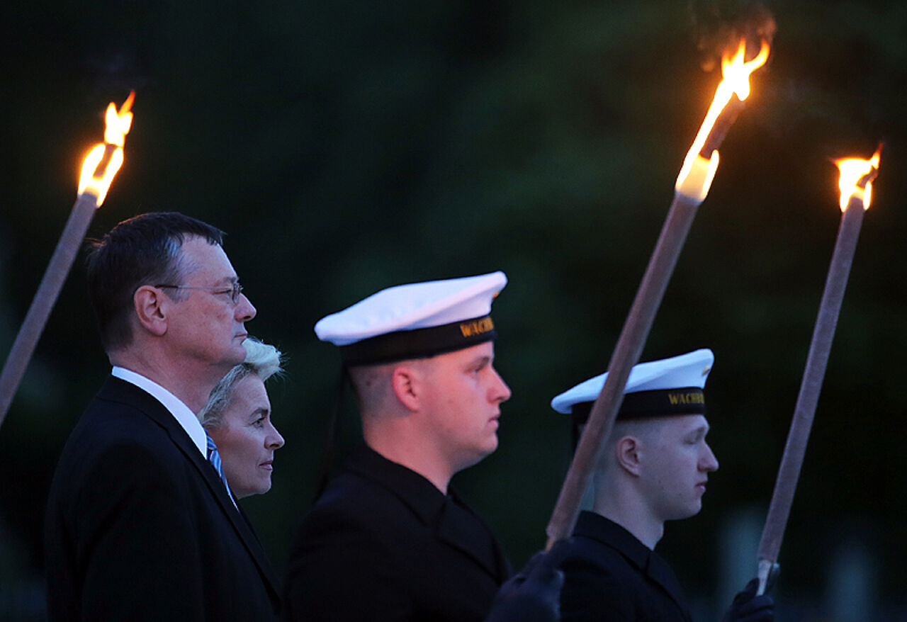 Soldaten des Wachbataillons halten Fackeln bei der Serenade zur Verabschiedung des Wehrbeauftragten des Bundestags, Hellmut Königshaus (l, FDP), mit Verteidigungsministerin Ursula von der Leyen (CDU) am 19.05.2015 im Bundesverteidigungsministerium in Berlin. Foto: dpa