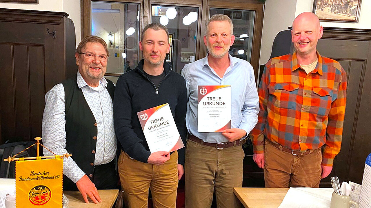 Ehrung beim 1. Reservistenstammtisch der KERH: Vorsitzender Michael Lipp, Hauptmann d.R. Christian Schmidt (25), Hauptmann d.R. Frank Steffens (40) und Reservistenbeauftragter der KERH, Stabsfeldwebel d.R. Thomas Rehder. Foto: KERH Augsburg