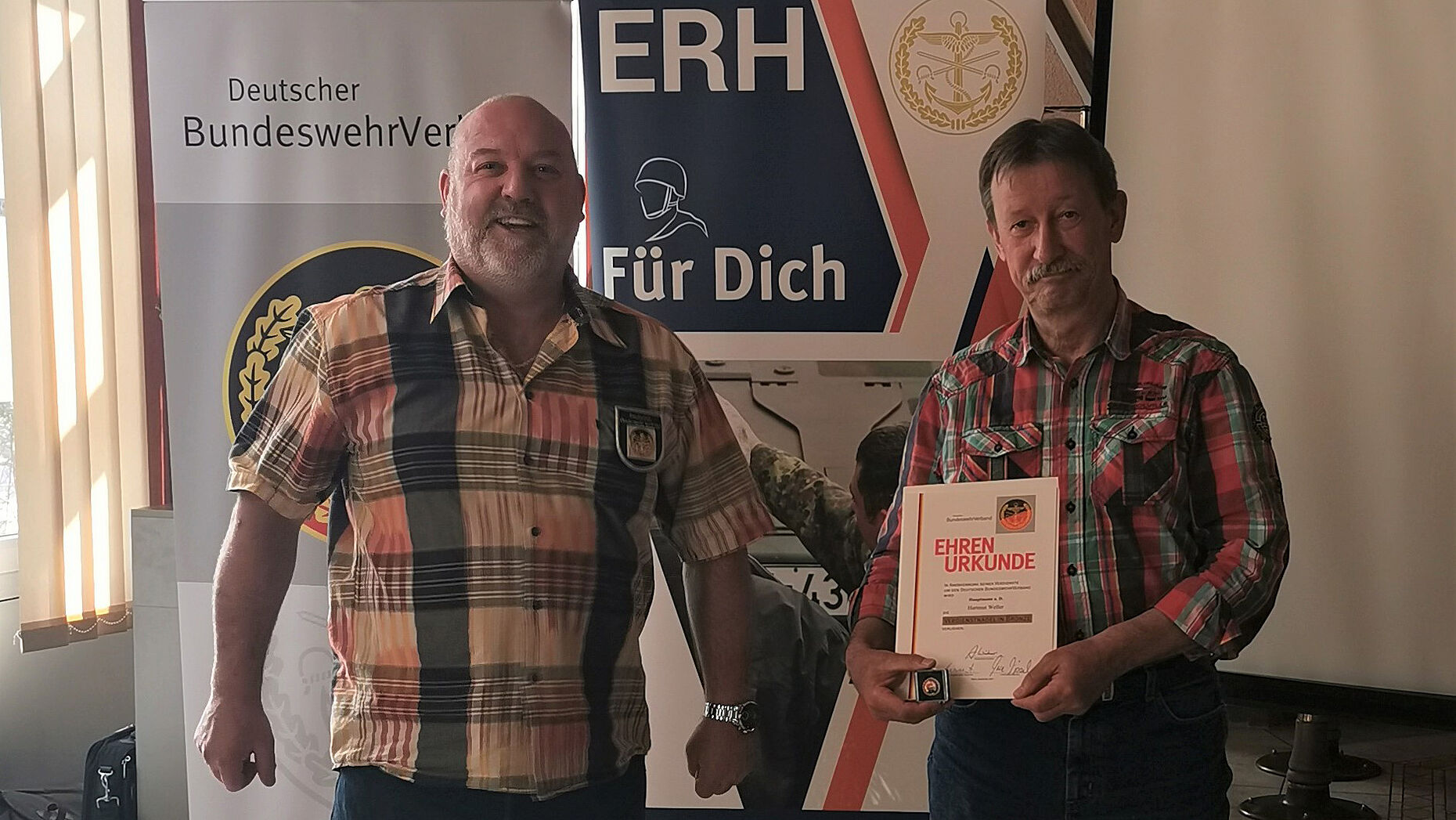 In Anwesenheit des Vorsitzenden Ehemalige, Reservisten und Hinterbliebene (ERH) im Vorstand des Landesverbandes Ost, Hauptmann a. D. Joachim Wohlfeld, konnte der Vorsitzende der KERH Bad Salzungen, Stabsfeldwebel a. D. Hagen Hildwein, zahlreiche Mitglieder zur Wahlversammlung begrüßen. In seinem Bericht über die abgelaufene Amtszeit ging der Vorsitzende auf die durchgeführten Aktivitäten ein, die durch die Corona-Pandemie eingeschränkt waren. Auch die Ergebnisse der 21. Hauptversammlung mit den dort beschlossenen Beitragserhöhungen und der ab Juli 2022 geplanten Einführung der Pflege-Assistance fanden dabei Erwähnung. Neben einem kurzen Grußwort war es Hauptmann a. D. Joachim Wohlfeld eine Freude, Hauptmann a. D. Hartmut Weller zur Auszeichnung mit der Verdienstnadel des Deutschen BundeswehrVerbandes (DBwV) in Bronze zu gratulieren.
