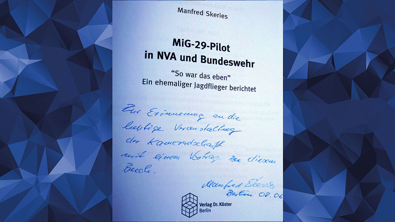 Mit Manfred Skeries, einem Mann, der sowohl in den Luftstreitkräften der Nationalen Volksarmee als auch nach der Wende in der Luftwaffe der Bundeswehr diente, hatte man einen interessanten Gesprächspartner gewonnen, der insbesondere die Phase der Wiedervereinigung und des Übergangs von Nationaler Volksarmee zu Bundeswehr in den Schwerpunkt seines Vortrages stellte.