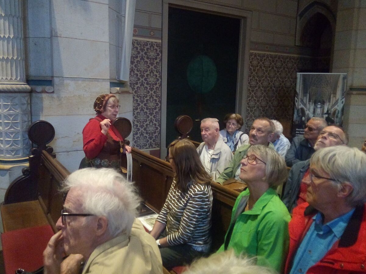 In historischer Verkleidung brachten die kundigen Kirchenführer den Teilnehmern an der Tagesreise die Schlosskirche in Lutherstadt-Wittenberg näher. Foto: Bernd Intemann