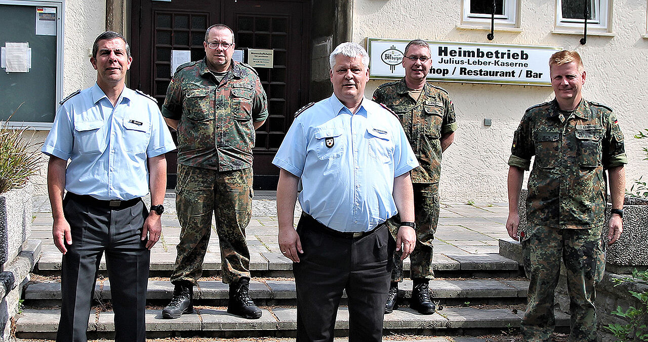 Der neue Vorstand: StHptm Andreas Quirin (Schriftführer, v. l.), Oberstlt Andreas Sieger (Beisitzer), Hptm Ingo Zergiebel (Vorsitzender), StFw Mark Ochmann (Stv. Vorsitzender), Oberstlt Jens Lorber (Beisitzer). Foto: DBwV/Hahn