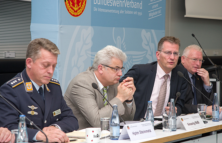 Nach der Begrüßung durch Oberstabsfeldwebel a.D. Hubert und Oberstleutnant d.R. Axel Knoerig, stellvertretender Vorsitzender der Arbeitnehmergruppe der CDU/CSU-Fraktion im Bundestag, erwartete die „Beteiliger“ ein straffes Programm. Viele Diskussionen drehten sich um die Soldatenarbeitszeitverordnung (SAZV). Das Thema bewegt die Bundeswehr zurzeit wie wohl kaum ein anderes. Ralf Brauksiepe, Parlamentarischer Staatssekretär im BMVg, räumte ein, dass bei der Umsetzung der SAZV an einigen Punkten nachgesteuert werden müsse. Im Kern sei es aber richtig, dass die EU-Arbeitszeitrichtlinie nun auch in der Bundeswehr angewendet wird. „Ja, wir wollten diese Arbeitszeitverordnung. Das hat auch etwas mit der Attraktivität des Berufs zu tun“, sagte Brauksiepe und gab sich zuversichtlich, dass die Anlaufschwierigkeiten überwunden werden können: „Ich bin mir sicher: Wir schaffen das!“