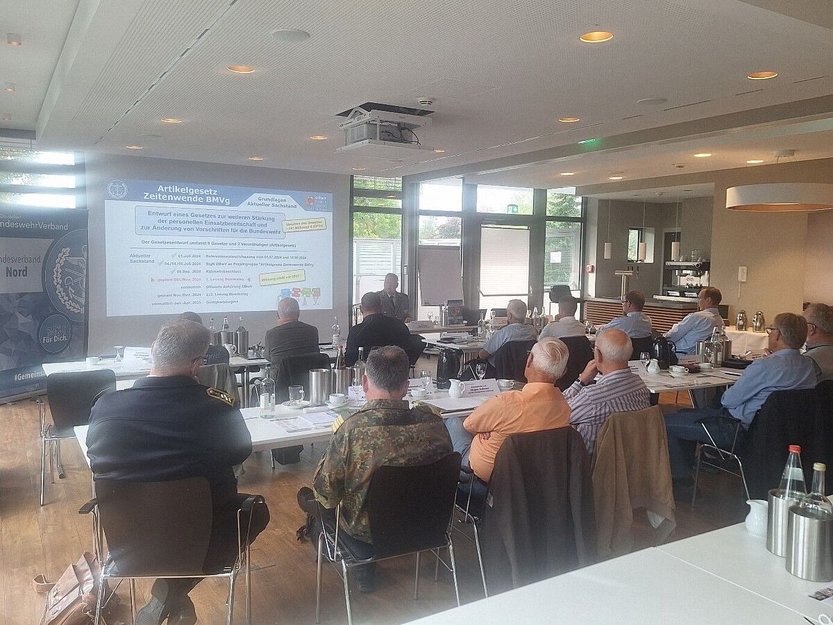 Rendsburg. In Rendsburg mit Blick auf den Nord-Ostsee-Kanal fand die zweite diesjährige Landestagung im Bezirk 1 statt. 20 Mandatsträger aus dem Norden Schleswig-Holsteins beschäftigen sich im Hotel ConventGarten mit Themen rund den Deutschen BundeswehrVerband. Schwerpunkt war die Auswertung des Verbandstages und die Vorbereitung der 2025 stattfindenden Landesversammlung. Am ersten Tag der Veranstaltung informierte der Landesvorsitzende Nord, Oberst Thomas Behr, zur aktuellen Verbandspolitik sowie zu derzeitigen Gesetzesvorhaben, wie zum Beispiel dem Artikelgesetz.