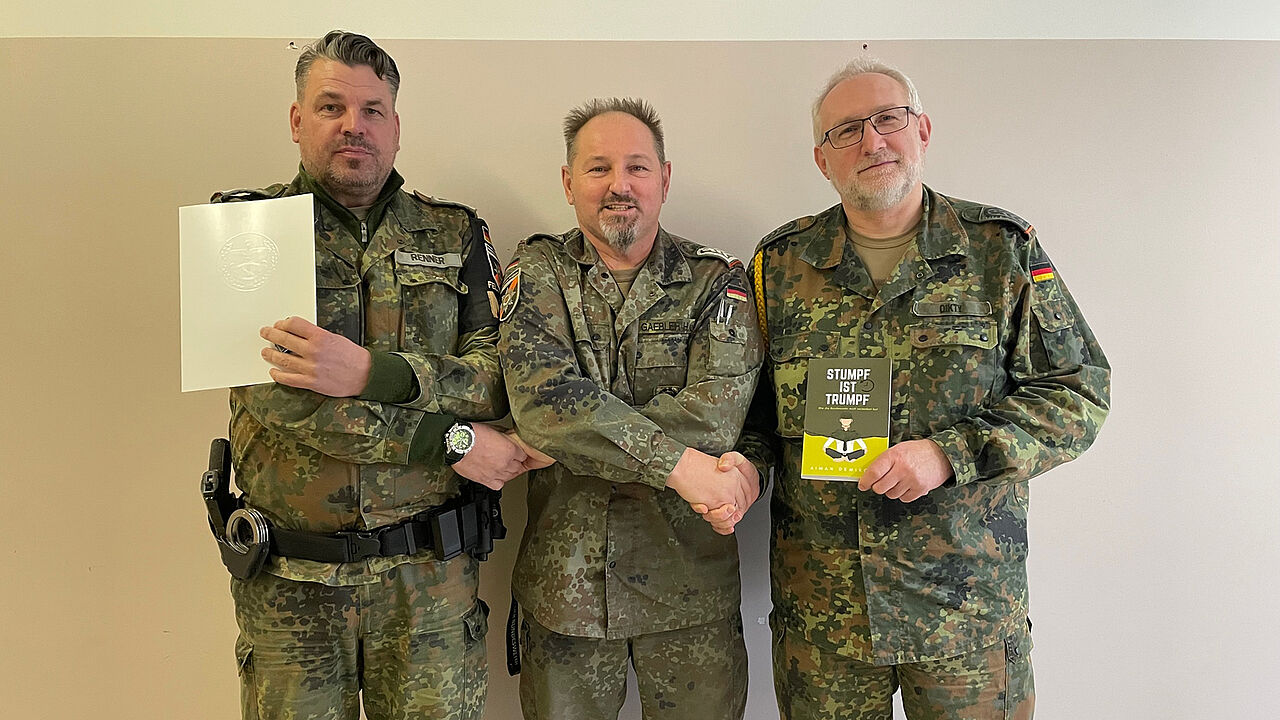 Hannover. Oberstabsfeldwebel Thomas Dikty hat als Anerkennung für seine Tätigkeit als Schriftführer der Truppenkameradschaft Scharnhorst-Kaserne einen Buchpreis mit Widmung des Landesvorsitzenden erhalten. Stabsfeldwebel Sascha Renner wurde für seine 25-jährige Mitgliedschaft im DBwV ausgezeichnet. Die Ehrung der beiden Hannoveraner Feldjäger übernahm der Kameradschaftsvorsitzende Oberstabsfeldwebel Heiko Gaebler.