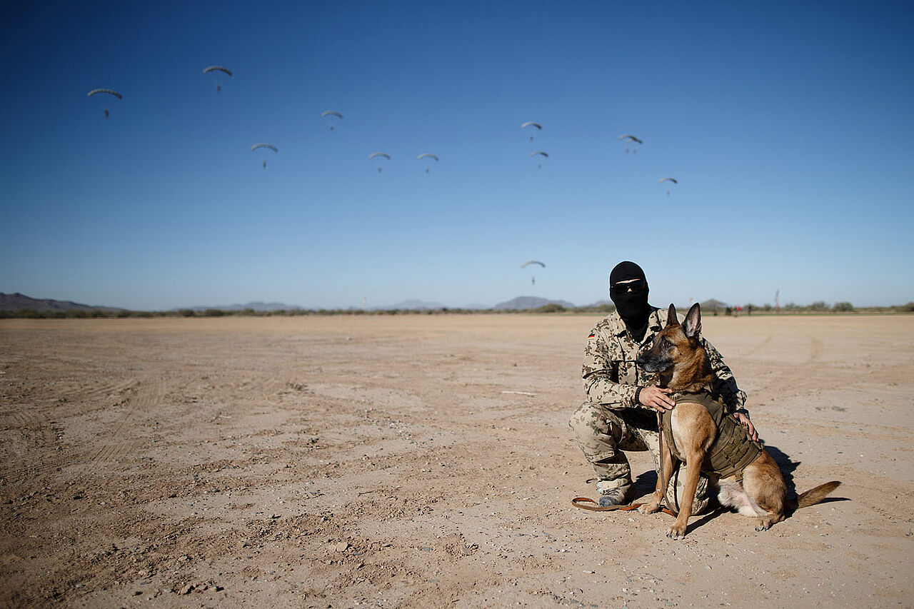 Hundeführer Hauptfeldwebel W. vom Kommando Spezialkräfte (KSK) nimmt mit Diensthund Diego an der Übung des taktischen freien Falls in Arizona/USA teil Foto: Bundeswehr/Jana Neumann