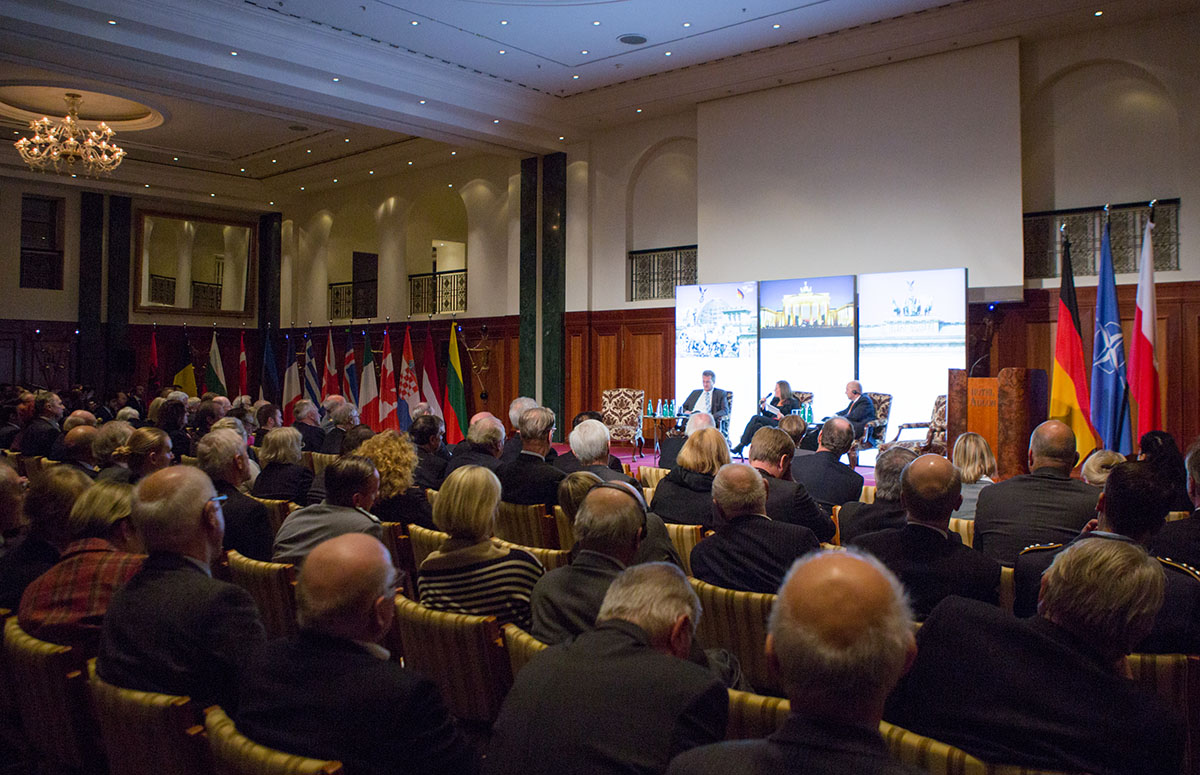 Generalleutnant Horst-Heinrich Brauß, beigeordneter Generalsekretär der Nato für Verteidigungspolitik und Streitkräfteplanung, fasste die Lage in der ersten Diskussionsrunde zusammen: Er sah eine zunehmende militärische Bedrohung im Osten und eine zunehmende Destabilisierung im Süden. Beide Bedrohungen seien gleichermaßen relevant. Trotzdem verfolge die Nato weiterhin ihren 360-Grad-Ansatz. Die Einheit in der Allianz sei ihr „strategisches Gravitationsfeld“. Der türkische Nato-Botschafter, Mehmet Fatih Ceylan, bemerkte, dass kooperative Sicherheit und kollektive Verteidigung sowie Krisenmanagement richtig ausbalanciert werden müssten. Durch die ständigen Verletzungen des türkischen Luftraums, verursacht durch russische Flugzeuge, fühle sich sein Land bedroht. Tobias Linder, für die Grünen Mitglied des Bundestages, warnte vor einer „Renationalisierung der Sicherheitspolitik“, ein klares Bekenntnis zum Artikel 5 sei nötig. Abschreckung müsse glaubhaft sein, gleichzeitig müsse parallel ein Weg zur Deeskalation aufgezeigt werden. Eine Lockerung der Sanktionen gegen Russland ohne Entgegenkommen lehnte er ab.