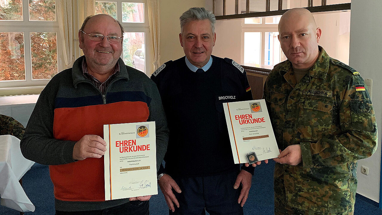 OStFw a.D. Brockholz (m) übergibt die Ehrenurkunden an StFw a.D. Aulich (l) und StFw Jaluschka (r). Foto: DBwV/ Giesecke
