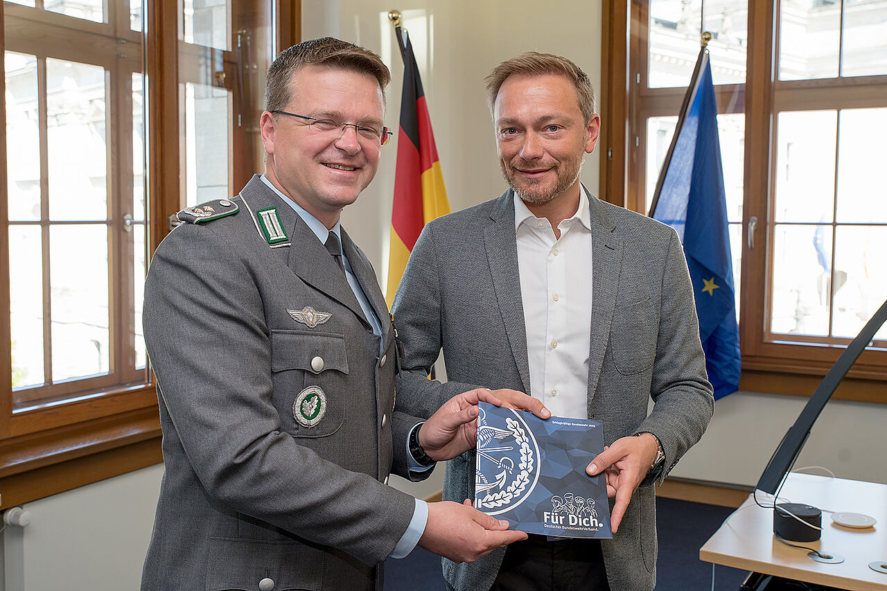 Der DBwV-Bundesvorsitzende Oberstleutnant André Wüstner (l.) bei der Übergabe der "BW 2025" an FDP-Chef Christian Lindner Foto: DBwV/Bombeke