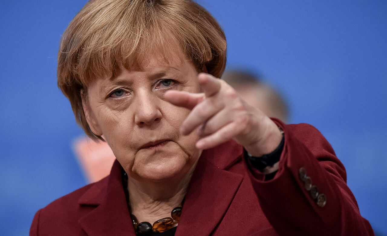 Die CDU-Vorsitzende und Bundeskanzlerin Angela Merkel deutet am 15.12.2015 beim Bundesparteitag der CDU in Karlsruhe (Baden-Württemberg) in Richtung Plenum. Die CDU diskutiert bei dem zweitägigen Parteitag unter anderem über die Flüchtlingspolitik. Foto: Uwe Anspach/dpa