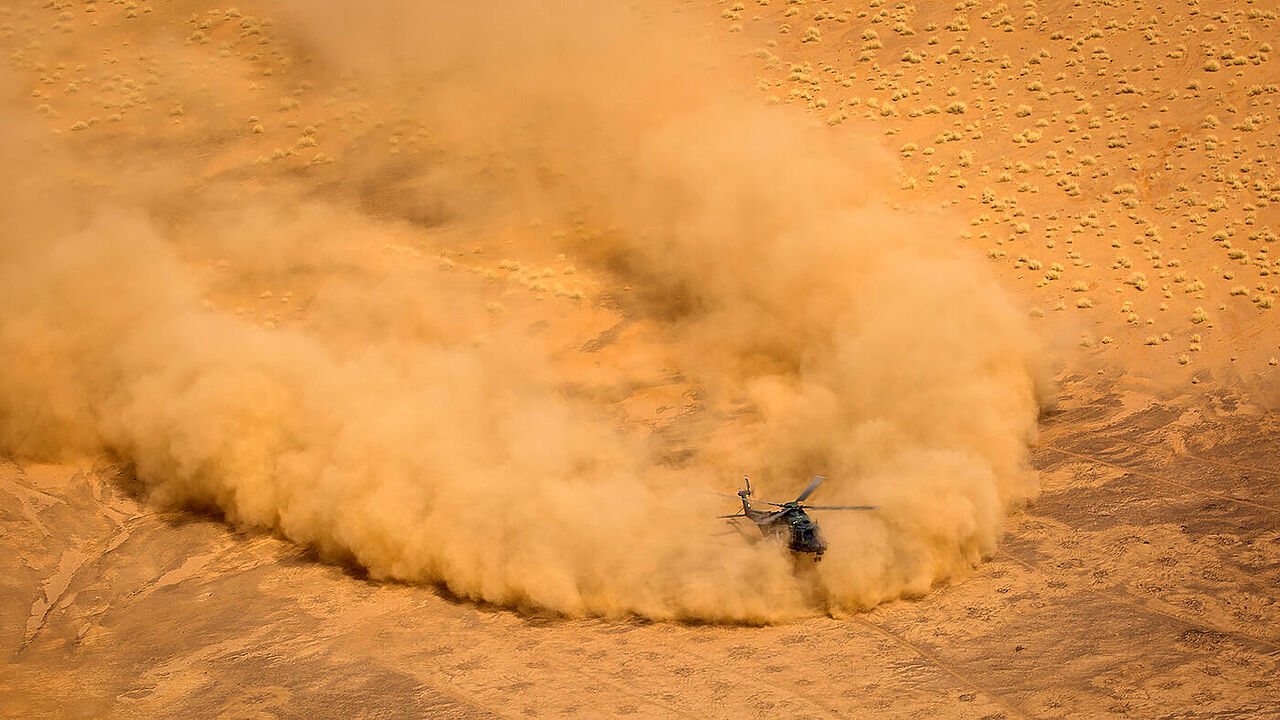 Ein NH90 landet in staubigen Wüste Malis. Technische Probleme bei dem Transporthubschrauber verschärfen aktuell die materielle Situation bei den Heeresfliegern. Foto: Bundeswehr/Marc Tessensohn
