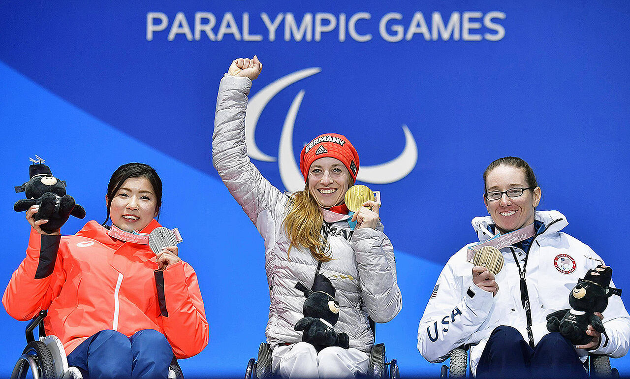 Anna Schaffelhuber (Mi.) bejubelt ihre Goldmedaille Foto: imago/Kyodo News