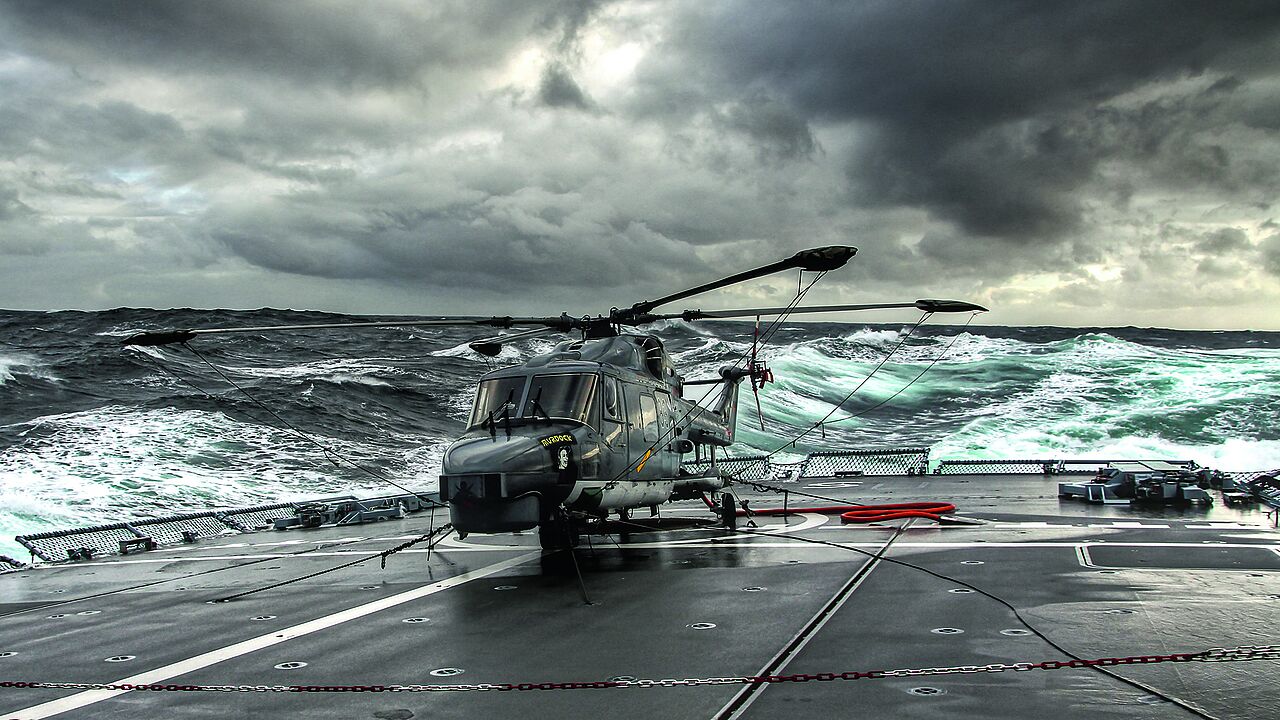 Ein Bordhubschrauber „Sea Lynx“ steht bei schwerer See an Deck der Fregatte „Sachsen“. Foto: Bundeswehr/Jan Pahl