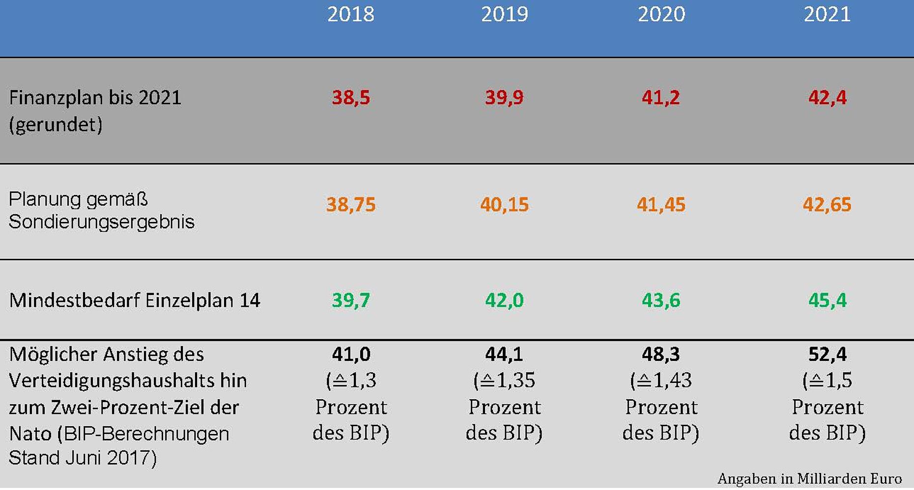 Zurück ins hier und jetzt: Was „gerade ziehen“ bedeutet, können wir jetzt im Sondierungspapier lesen: Statt des im Minimum benötigten Anstiegs von insgesamt 9 Milliarden Euro zusätzlich zum 51. Finanzplan bis 2021 (siehe Tabelle) soll der Einzelplan 14 lediglich um rund eine Milliarde zusätzlich zum 51. Finanzplan steigen – eine weitere Milliarde ist für ODA, also Öffentliche Entwicklungszusammenarbeit, vorgesehen. Wie weit wir vom tatsächlichen Bedarf entfernt sind, kann jeder ableiten, der die Grundrechenarten beherrscht.