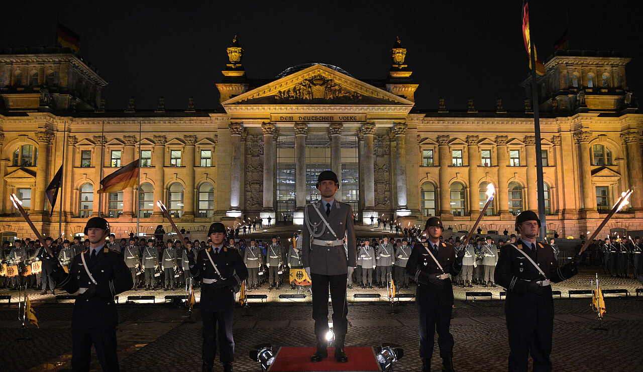 Zahlreiche Soldaten stehen am 11.11.2015 bei einem Großen Zapfenstreich vor dem Reichstagsgebäude in Berlin. Die Bundeswehr begeht den Vorabend des 60. Jahrestages ihrer Gründung mit dieser höchsten Form der militärischen Ehrenbezeugung. Am 12. November 1955 erhielten die ersten 101 Soldaten ihre Ernennungsurkunde. Foto: Rainer Jensen/dpa