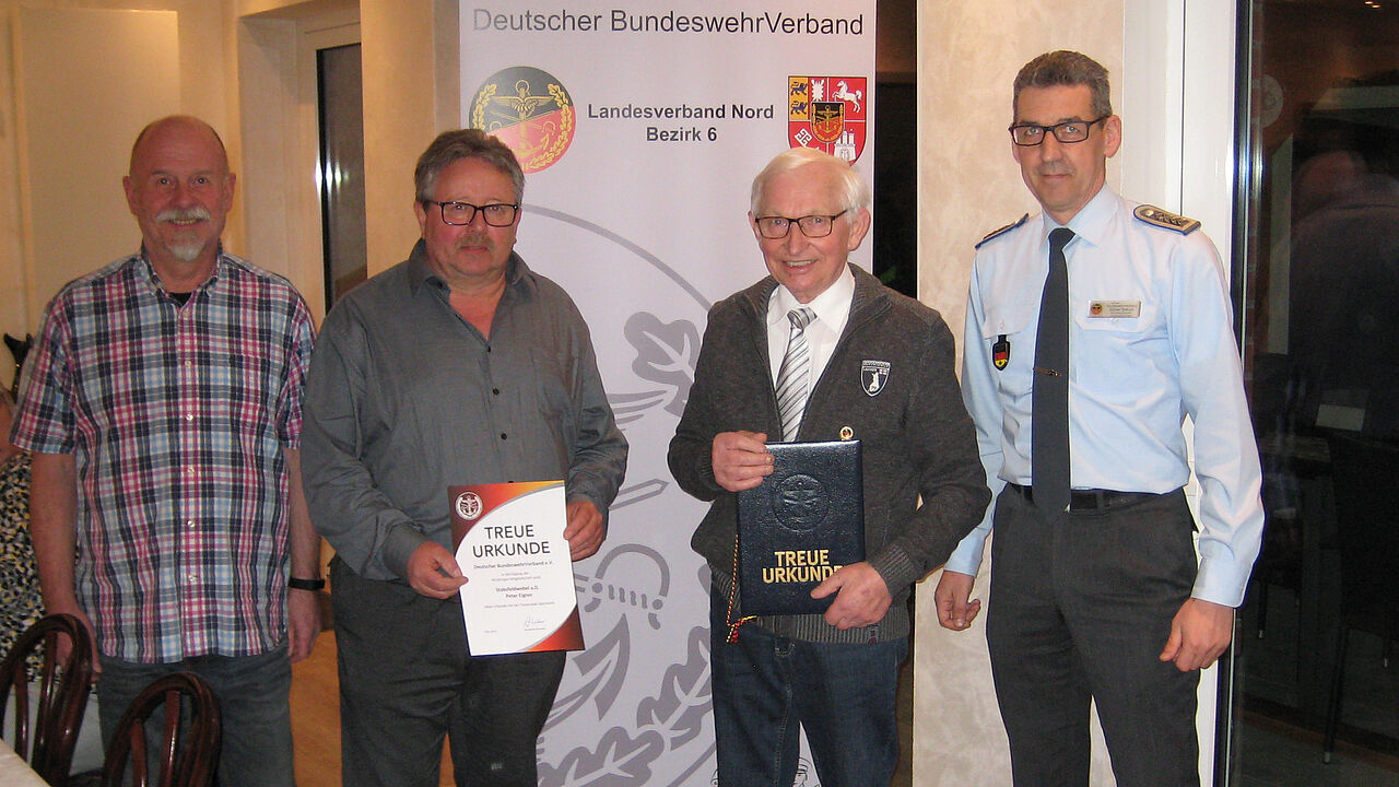 Diepholz. Die Mitgliederversammlung der Diepholzer selbstständigen Kameradschaft der Ehemaligen, Reservisten und Hinterbliebenen nutzte deren Vorsitzender, Hauptmann a.D. Joachim Triemer, um die Corona-Zeit zu bilanzieren und den bisherigen stellvertretenden Vorsitzenden Oberstleutnant a.D. Wolfgang Fischer zu verabschieden. Dieser zog in seine „alte Heimat“ nach Darmstadt und steht der Kameradschaft nicht mehr zur Verfügung. Der Vorsitzende im Bezirk 6 des Landesverbandes Nord, Oberstabsfeldwebel Oliver Sekuli, ging aus Sicht des Verbandes ebenfalls auf die vielen Monate der pandemiebedingten Einschränkungen ein. Aber auch Ehrungen kamen nicht zu kurz: Stabsfeldwebel a.D. Peter Eigner wurde für 40 Jahre Mitgliedschaft, Stabsfeldwebel a.D. Wilhelm Steinmann für 60 Jahre im DBwV ausgezeichnet. Der während des Treffens neu gewählte Vorstand setzt sich wie folgt zusammen: Vorsitzender bleibt Hauptmann a.D. Joachim Triemer, der zugleich Kassenwart sein wird. Schriftführerin wurde Elsa Karstens, als Beisitzer fungieren Sylvia Triemer, die Oberstabsfeldwebel a.D. Jens Ewert, Rudi Gogolin, Uwe Leymann und Manfred Loos sowie die Stabsfeldwebel a.D. Thomas Hinke und Werner Schwandt.