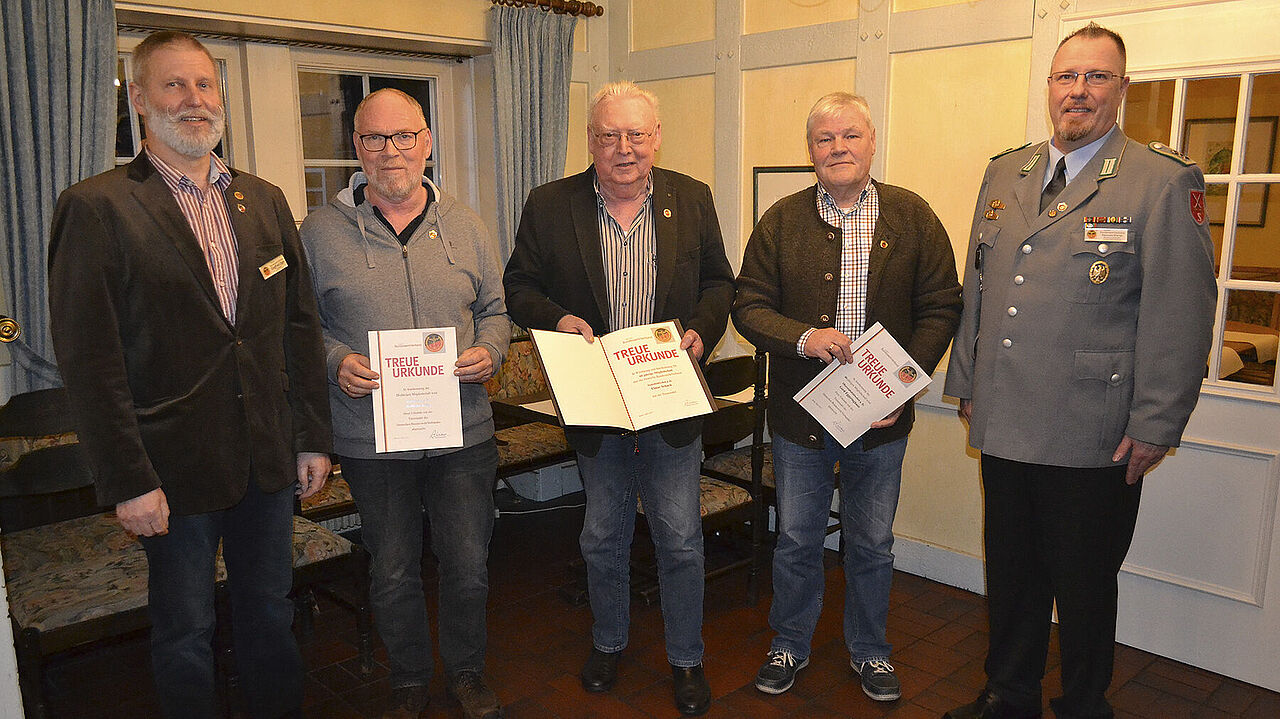 Danach ehrten der anwesende, vor wenigen Wochen neu gewählte Vorsitzende des Landesverbands-Bezirks 4, Stabsfeldwebel Hannes Dreier aus Munster, und der Vorsitzende der sKERH Jäger Hauptmann a. D. Wolfram Köhr für 25 Jahre, Oberstabsfeldwebel a. D. Gerd Eggeringhaus für 40 Jahre und Stabsfeldwebel a. D. Elmar Schuch für 60 Jahre (!) Mitgliedschaft im Deutschen Bundeswehrverband und überreichten entsprechende Treueurkunden und –nadeln.