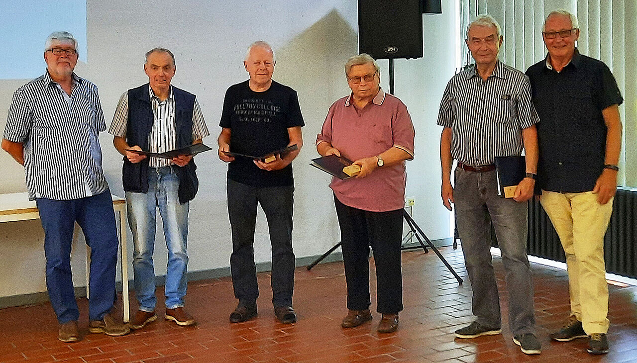 Stabsfeldwebel a.D. Roland Brandl (v.l.) mit den Geehrten Oberstabsfeldwebel a.D Helge Herbert, Hauptfeldwebel a.D. Josef Seifriedsberger, Stabsfeldwebel a.D. Franz Weis, Hauptmann a.D. Jochen Gartmann sowie KERH-Vorsitzender Stabsfeldwebel a.D. Heiko Schmidt. Foto: Rainer Beckert